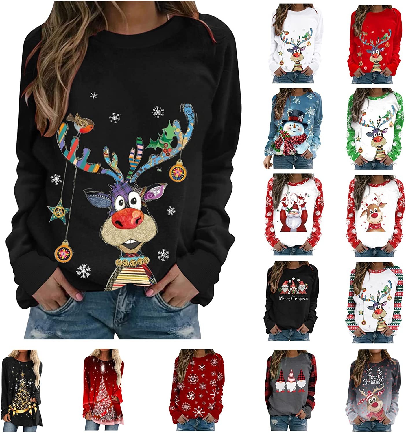 [CHRISTMAS]: christmas sweatshirt for women featured Long Sleeve, round neck,striped ,color block, Christmas tree, letter printing, Funny Christmas Elements Print Shirts,Casual O-Neck Shirt. Cute and funny print,Santa Claus, Gnomes, Christmas tree, elk, reindeer, brighten up your holiday!