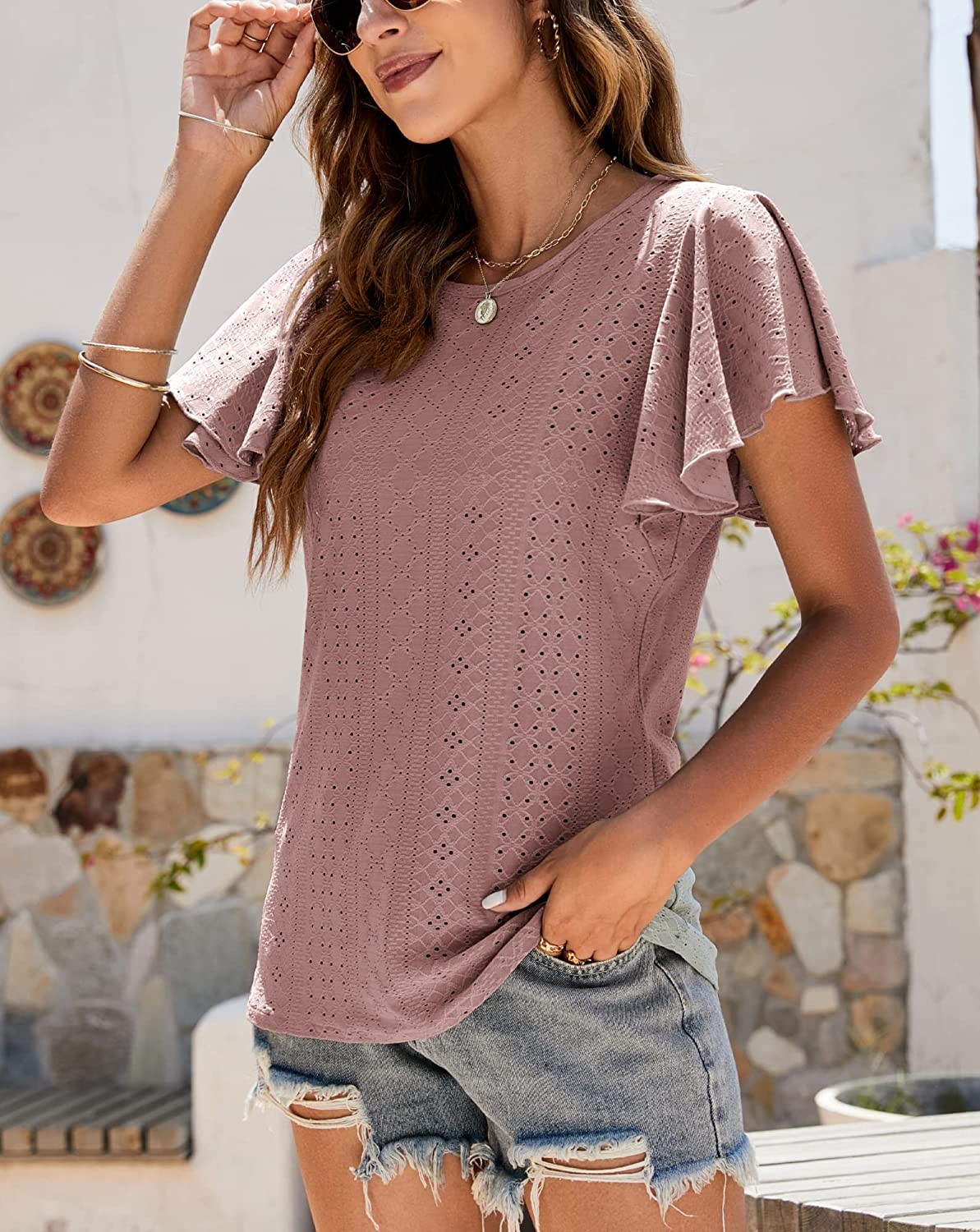 [Cute Ruffle Sleeve Top]-This cute and stylish top combines a variety of classic fashion elements,Ruffle sleeve,Unique pointelle design and classic crew neck, chic look. Casual and loose style fits for any body shape, must-have for women wardrobe.