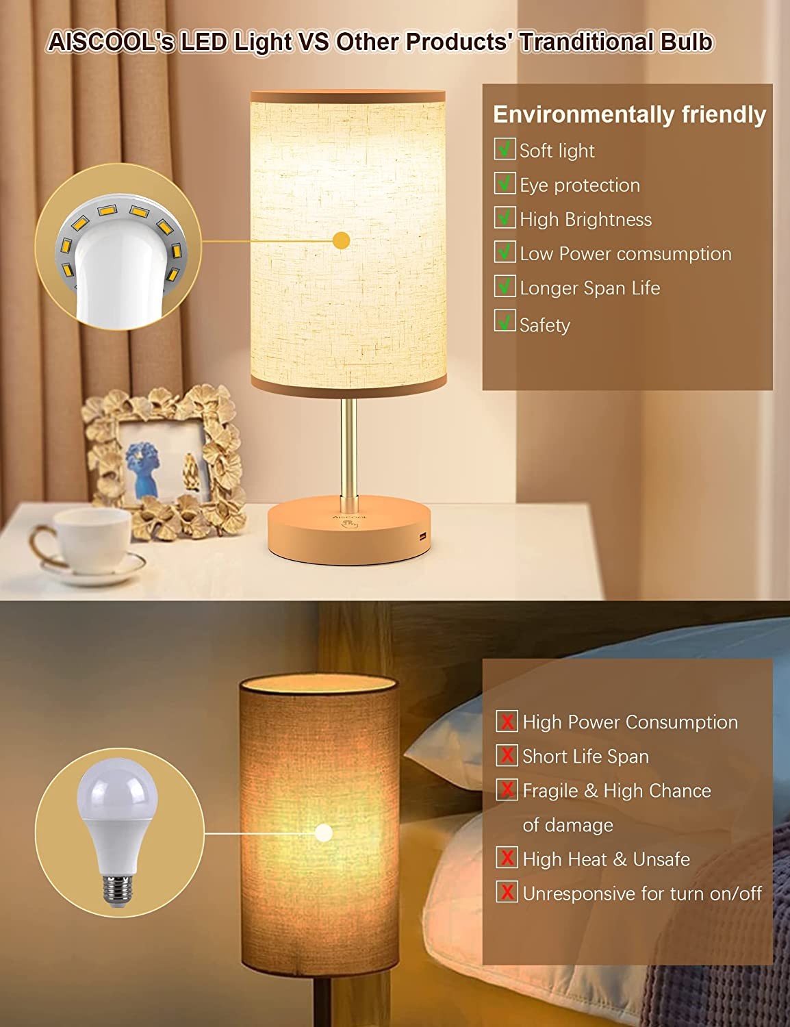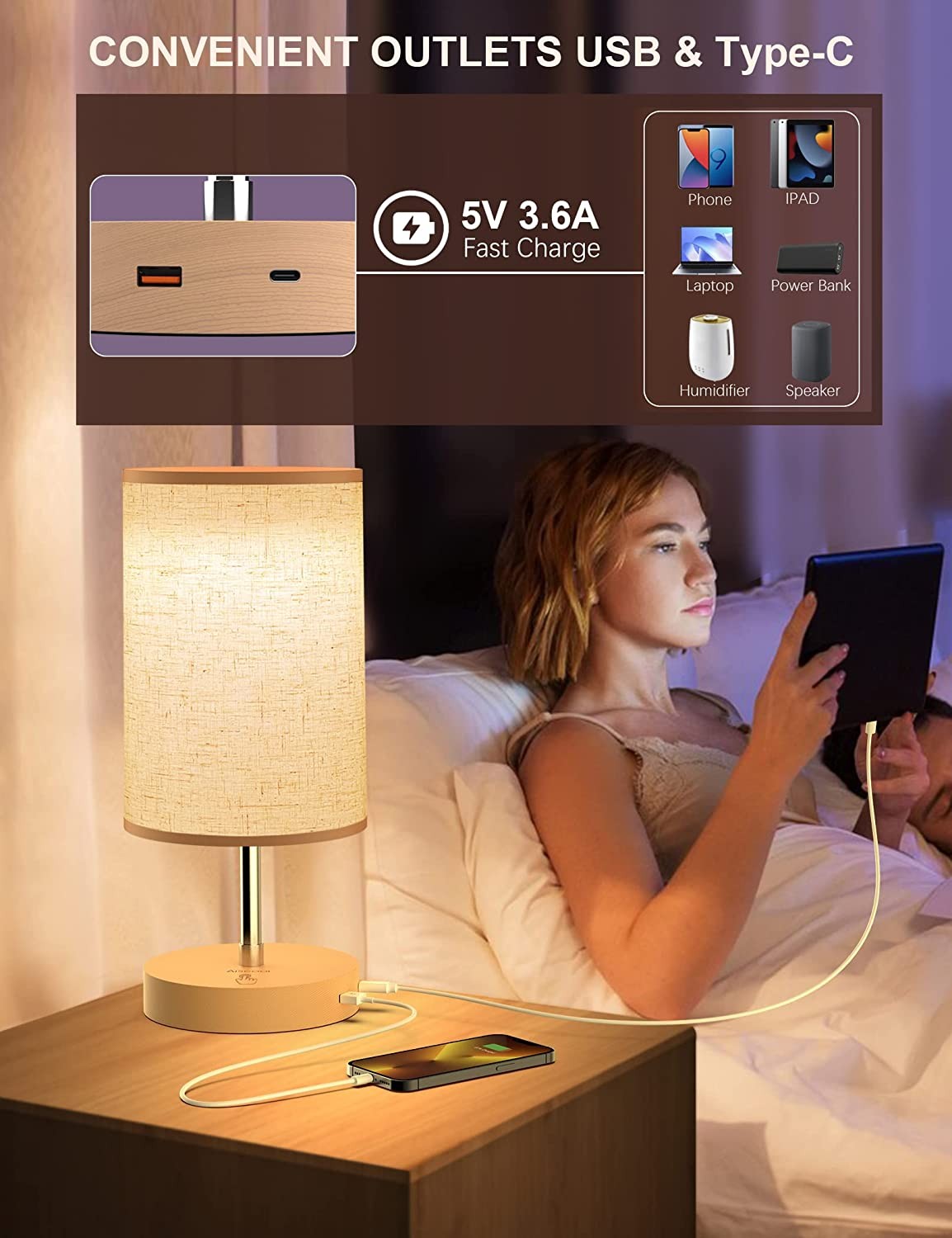 ?【Stepless 2-100% Dimmable&Touch Control Table Lamp】This bedside lamp is stepless dimmable with touch control(long press to turn UP/DOWN the brightness 2%-100%). Forget those trouble issues from the ordinary lamps that just offer 3 dimmer levels, we provide a ideal nightstand lamp for bedroom, living room, office, kids room, etc. *Memory Function: At the next turning ON, the bedroom lamp will run the last brightness if the power is not ever removed. ?【Adjustable Height Table Lamp】The bedside lamp comes with a adjustable stand, which could be adjusted the height from 12.6” to 20”. In addition, it’s made of anti-corrosion and non-rusting material. Yeah, as you could see, 99% of the other table lamps on the market have never considered these needs of the users. The AISCOOL’s touch bedroom lamp could be adjusted the height comformed to the different use occasions. ?【USB &Type C Charging Ports】On the wooden base of the bedside table lamp, there are USB port and Type C port for mobile phones, tablets, Kindles, iPad etc. Your devices can be charged at fast speed even when the touch nightstand lamp turned off as long as the power is not ever removed. The output range is 5V/3.6A,9V/2.5A and 12V/2A, it will automatically adjust the voltage and current according to the charging protocol of your device. ?【Built in LED Lights & Multiple Protection】Different from most of the other desk lamps, our lamp is built in LED lights instead of bulb that requires times and times replacements. LED night lamp with a lifetime over 50000H offer brighter light but spend less power. You will get bright but not dazzling light when reading, and it’s also soft enough as a nightstand table lamp. As to the safety, there is overvoltage/undervoltage/short circuit protection. ?【Humanized Design】The bedside table lamp possess ①Linen lampshade with excellent light transmittance and soft light; ②Stainless Steel Stand: Light weight, High hardness and Adjustable Height; ③Soild Danish Beech: Exquisite Wood Grain, Sturdy and Durable;④Assembled nightstand lamp: Without the trouble of assembly, provides the most comfortable lifestyle. ♚(WORRY-FREE)♚?7*24H Quick and Sincere Service ✎✉ Any doubts or problems, contact us via Amazon message box.