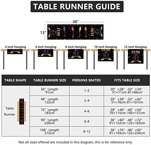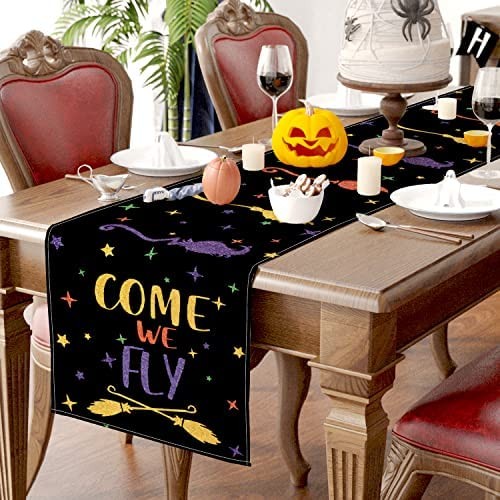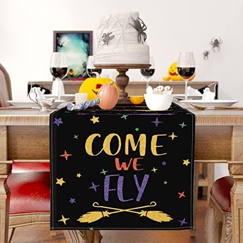 Siilues 150g Thicken Halloween Table Runner, Come We Fly Hocus Pocus Broom Halloween Decorations Seasonal Fall Holiday Decor for Indoor Outdoor Halloween Party Dining Table Decor (13" x 48")