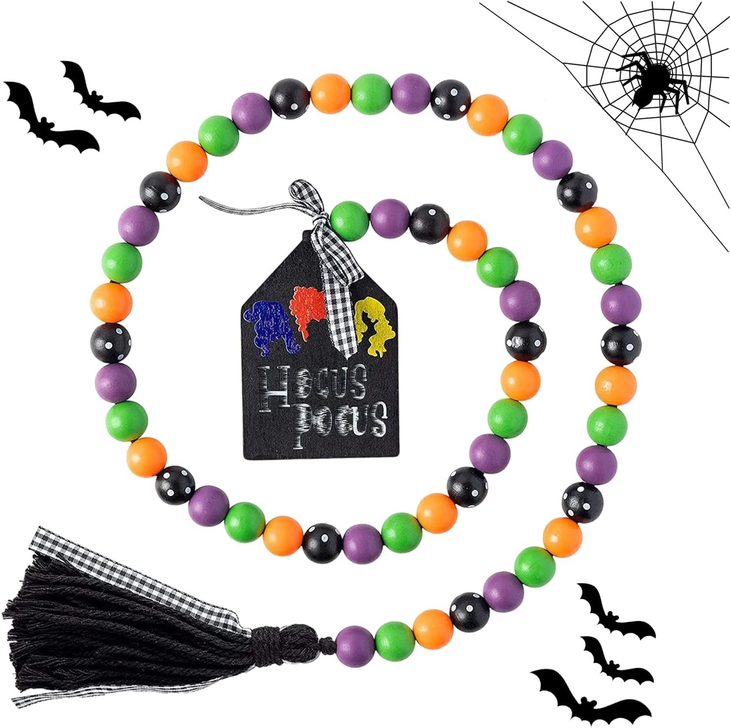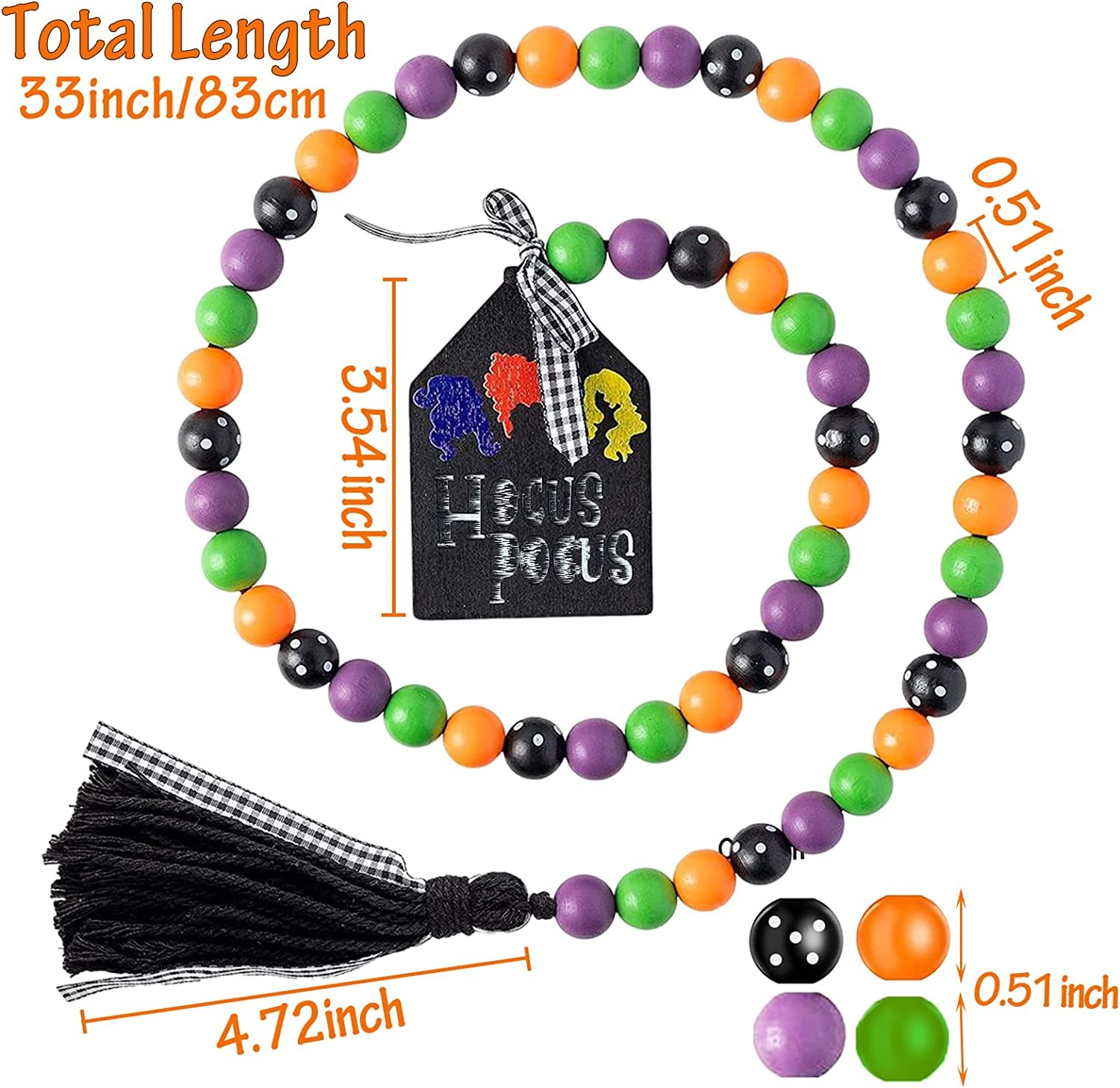 Halloween Wooden Bead Garland Decor: One long 33" Halloween wooden beads garland come in one package, made up of 44PCS beads in 4 colors, one end knotted with tag ornament, the other end decorated with black cotton rope tassels and plaid braid. Classic beads decor designed to add more Halloween atmosphere in your house. Dimension: The Halloween wood beads garland with tassel measures 33 inches in total length( With 4.72 inches tassel and 3.54 inches tag. Perfect size of Halloween adornment adding pleasant and warm atmosphere for your house. Suitable for decorating your farmhouse rustic tiered tray, fireplace, wall and so on. High-Quality Material: These wooden beads and tag decor are made of natural wood material, odorless, smooth and comfortable to touch. And the decorative tassels are cotton made, the thread to string the beads adopting Jute Rope, not easy to crack. Our Halloween wooden bead garland is durable & reliable, still shiny & non-fading even after years of use. Wide Application: These Halloween tiered tray decors can’t be better decoration hanging on fireplace, mantle, tiered tray, farmhouse, table centerpiece, door handles, window, walls, tree. Eye-catching ornament to put in your house, directly feeling the excitement of the Halloween day. Beaded Garland Decor: These fall farmhouse wood bead garlands feature harmonious Halloween colors in pumpkin orange, dark in white dots, dark purple and green. Designed with eye-catching tags and classic black tassels, well expressing the welcome to Halloween Day. Also, could as Halloween theme party decoration gift, bringing more happy Halloween vibe to their houses.