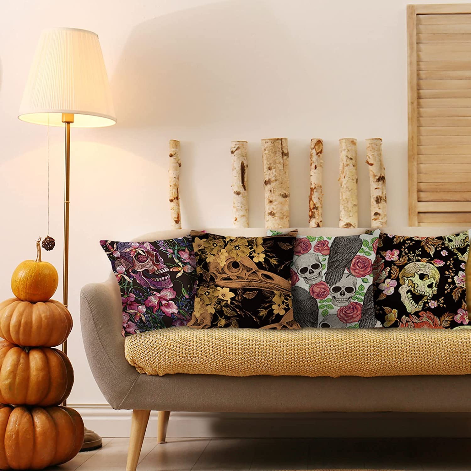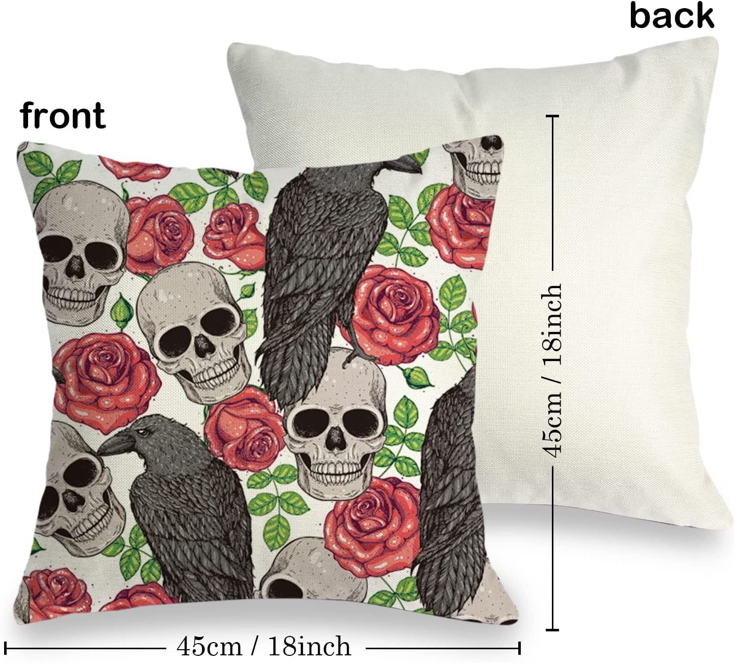 Set of 4 Horror Pillow Covers, Vintage Halloween Throw Pillow Covers, More Than Just Halloween Decorations with Aesthetic Patterns, Crows, Skulls, Flowers, Roses, 18 x 18 inches