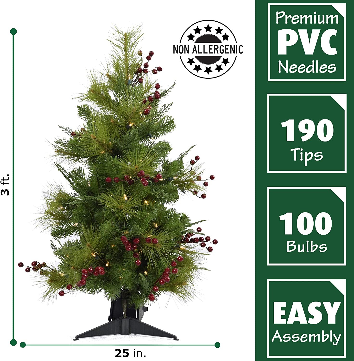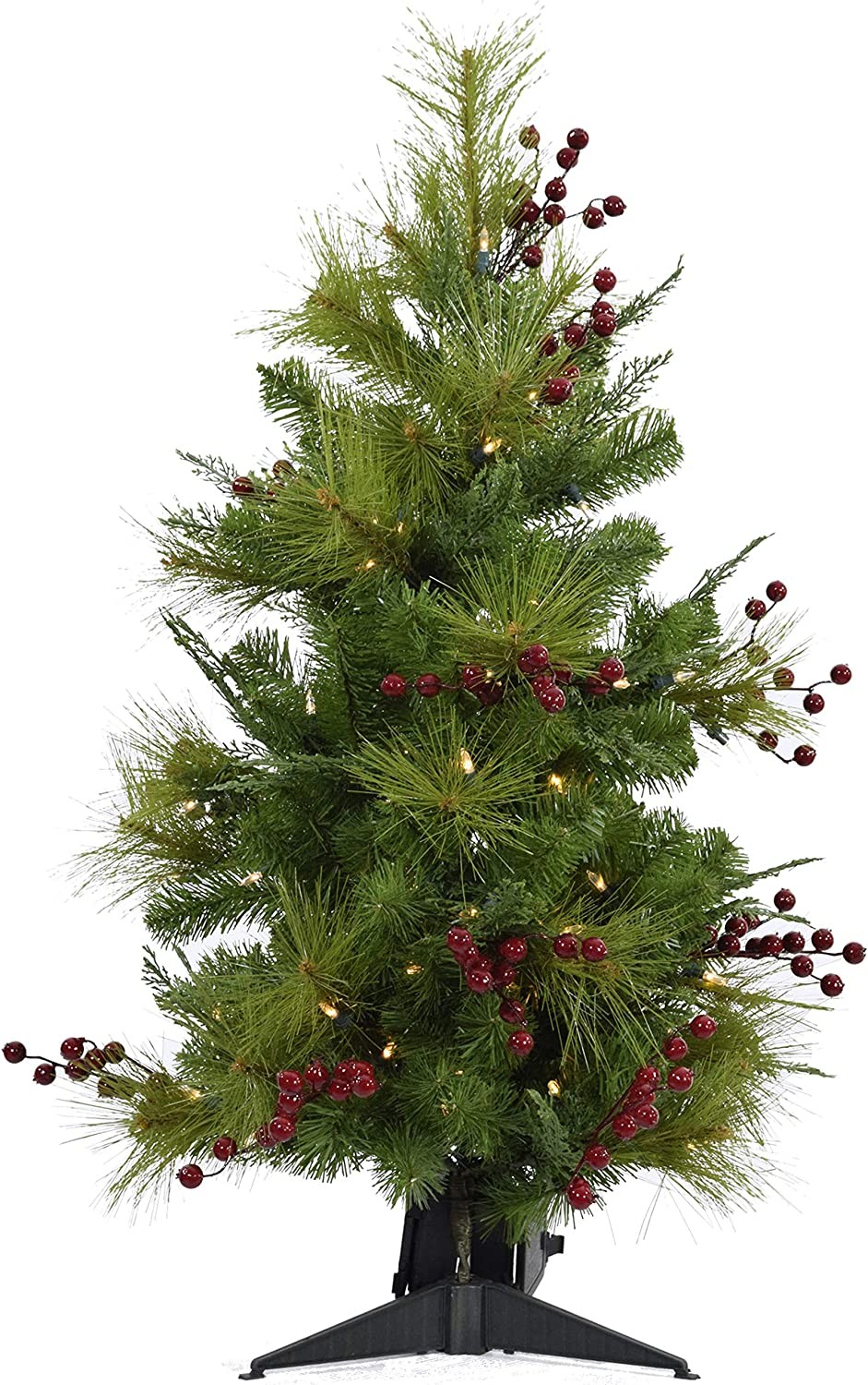 DECK YOUR HALLS: Welcome guests with this beautiful accent tree next to your front door, in your entryway, on your hearth, or in any place you want to add some Christmas joy. Measures 36-inches tall. DESIGNER FINISHES: Handcrafted lifelike accent tree trimmed with red berries. Pre-lit with festive battery operated warm white LED lights, batteries not included. TIMELESS ELEGANCE: A wonderful alternative to live greenery and arrives fully assembled. Some light shaping and fluffing and your tree is ready to display. HIGH-QUALITY MATERIALS: Designed using high-quality artificial materials crafted to last season after season. No maintenance required just dust lightly as needed. Suitable for indoor or covered outdoor use. FRASER HILL FARM IS HERE TO HELP: If you are not completely satisfied with your purchase, your item was damaged during shipment, or you have any questions please feel free to contact our customer service team for assistance. GOES BEAUTIFULLY WITH AN ARTIFICIAL CHRISTMAS TREE FROM FRASER HILL FARM: Tie your entire look together by pairing your decor with a beautiful artificial tree from Fraser Hill Farm. Choose from traditional green, stunning snowy flocked, pre-lit or unlit, slim or standard. Fraser Hill Farm's extensive holiday collection will provide you years of beautiful holiday decor.