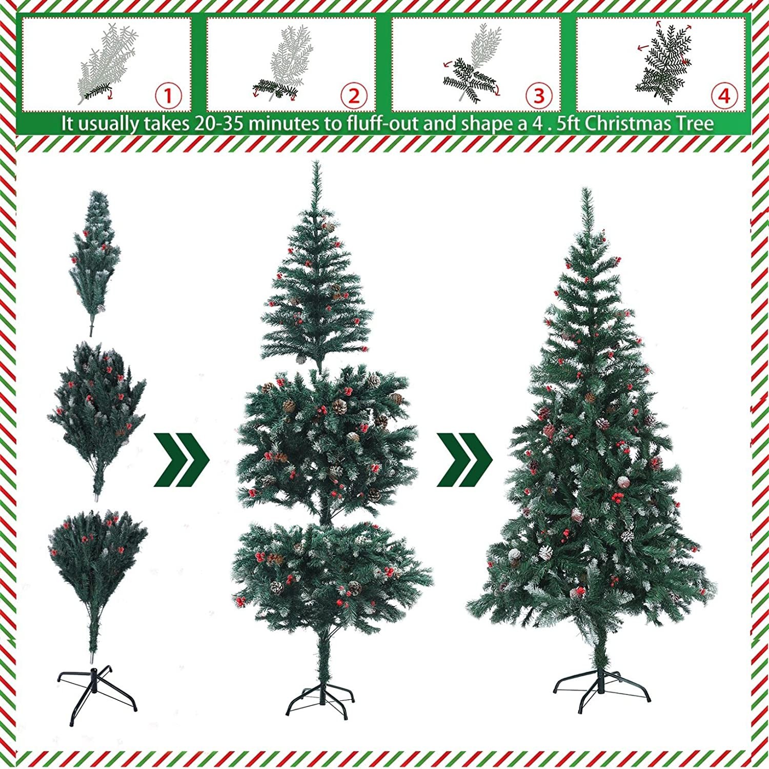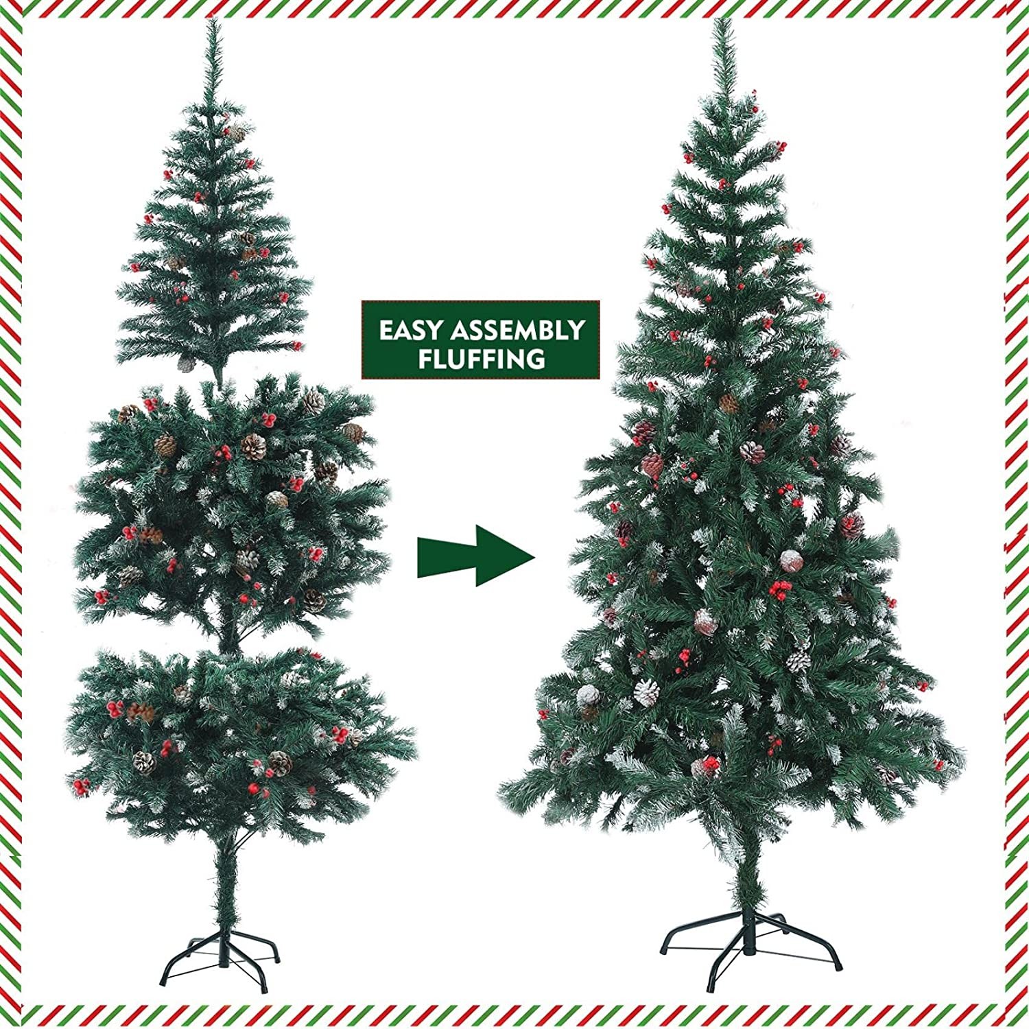 【Realistic Looking Tree】This Christmas pine tree with carefully crafted flocking snow design, green branches with pine cones and red berries, the overall color matching is bright, making the Christmas tree look richer and warmer, and making your family full of Christmas atmosphere 【Quick & Easy Assemble】Assembly and disassemble is quick and easy. And this christmas tree has plenty of space. Shape it at first then you can add other ornaments and gifts. 【Eco-friendly Material】The blades of our christmas tree are made from high quality PVC material, anti-deformation,waterproof and suitable for outdoor,allowing you to make the most of it year after year. 【Metal Stand】Soloven christmas tree uses metal stand instead of plastic stand, and add plastic cover on the end. Adding the stability of the tree,helping the tree stay straight in the wind and protecting your floor. 【100% SATISFACTION GUARANTEE】Upgraded package to avoid damages during shipment. Our professional customer service team will address your any concerns within 24 hours.