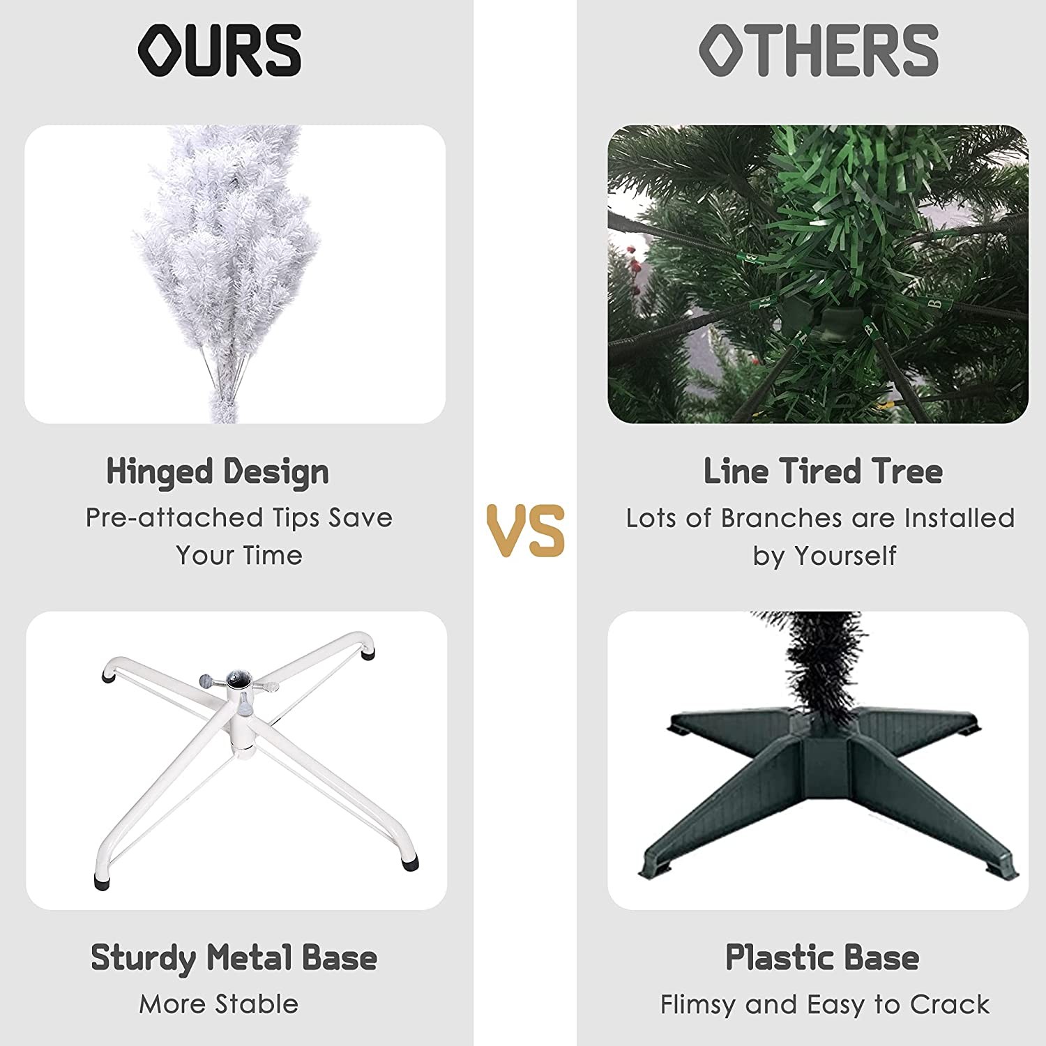 Crafted with 800 branches make the Christmas tree look lush, just like a real pine tree to show your spirit. Solid metal tree base for stronger support, anti- tilt or collapse Great for indoor or outdoor. Decorate your office, living room, garden or any entrance. The artificial Christmas Pine Tree made from PVC, it is safe, flame retardant and durable. Simple assembly and spend some time to get all the branches spread out.