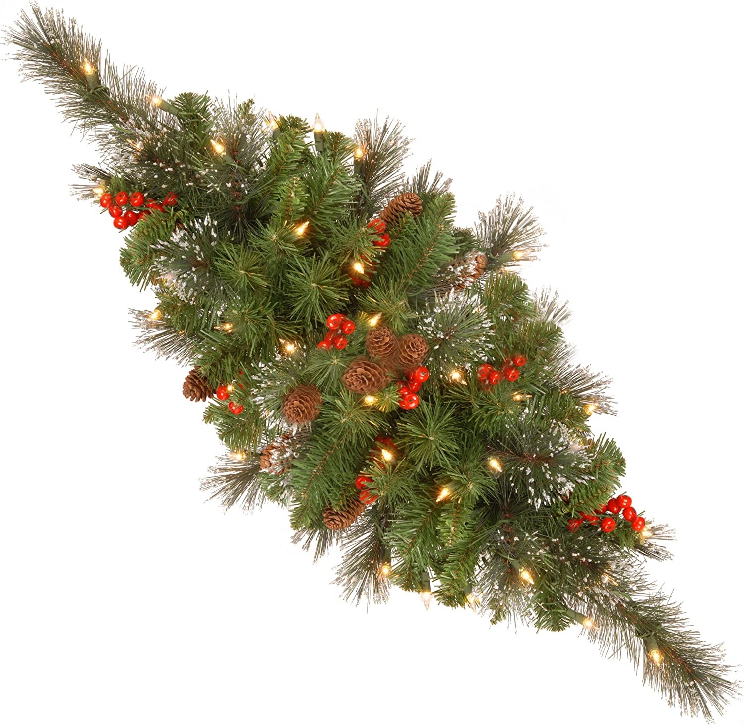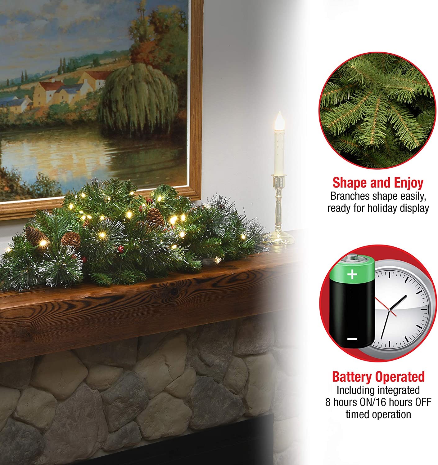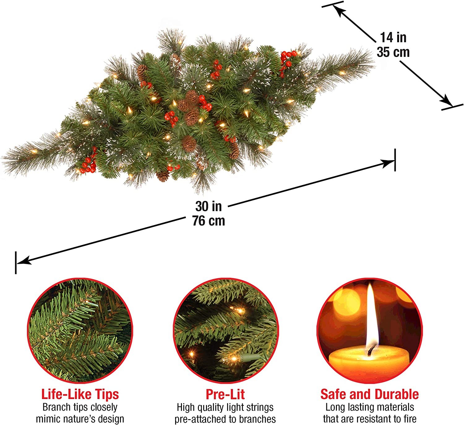 Nullify Imported FESTIVE APPEAL: Our pre-lit artificial branches look ultra-realistic and lifelike. With 97 individually crafted branch tips, this garland is as charming as the real thing. EASY MAINTENANCE: No need to clean up loose needles or drying out, this spirited Christmas centerpiece will last many holidays with it's time-tested, fire-resistant, and non-allergenic needles. BUILT-IN LIGHTING: Neatly trimmed with pine cones, red berries, silver bristle, glitter and 35 battery-operated warm white LED lights with integrated 6 hours On/18 hours Off timer. IDEAL SIZING: The centerpiece measures 30 Inches in length, and 14 Inches in width. BUY WITH CONFIDENCE: National Tree Company is a USA-based family owned and operated business established 60 years ago. Our friendly USA customer service staff will assist with product and parts questions.