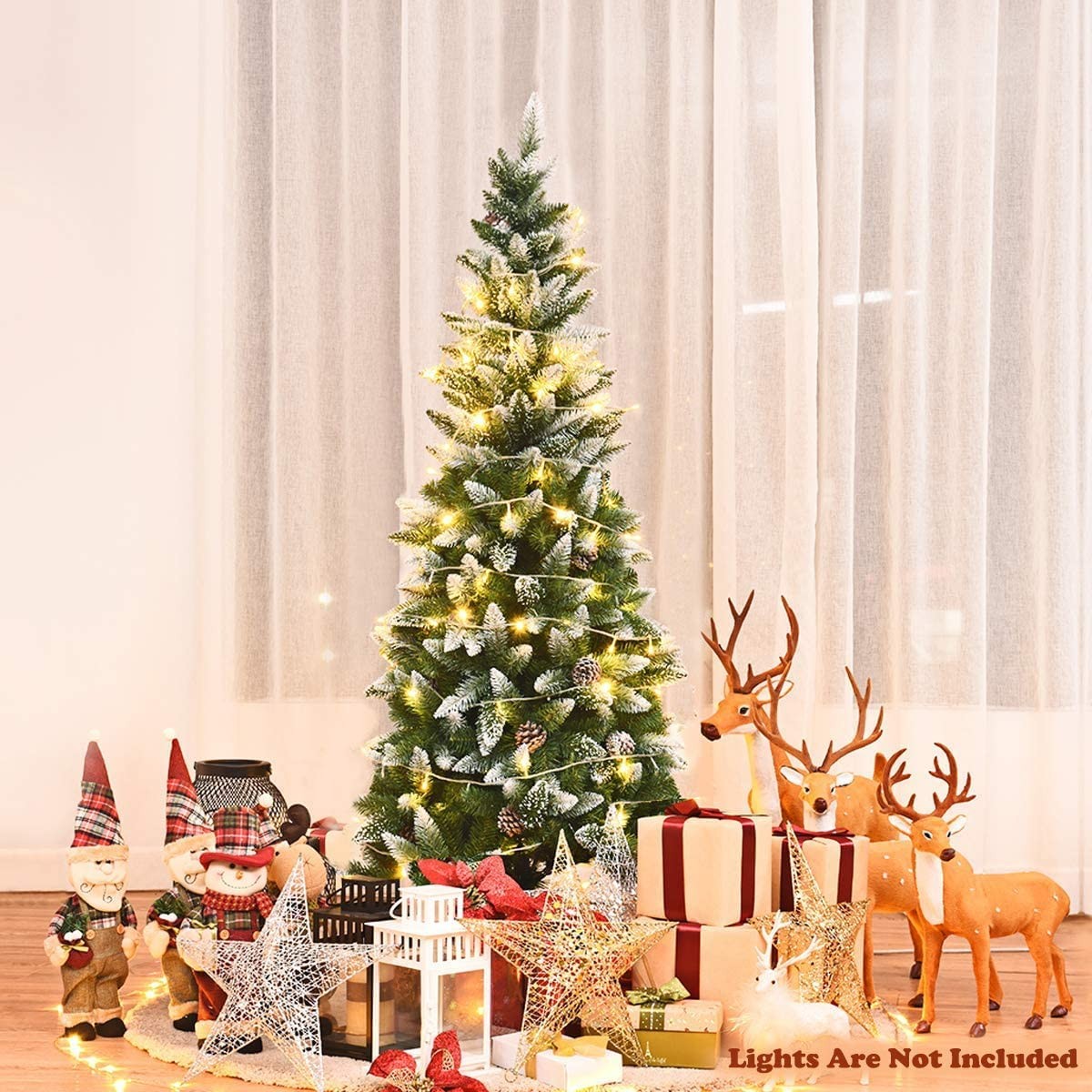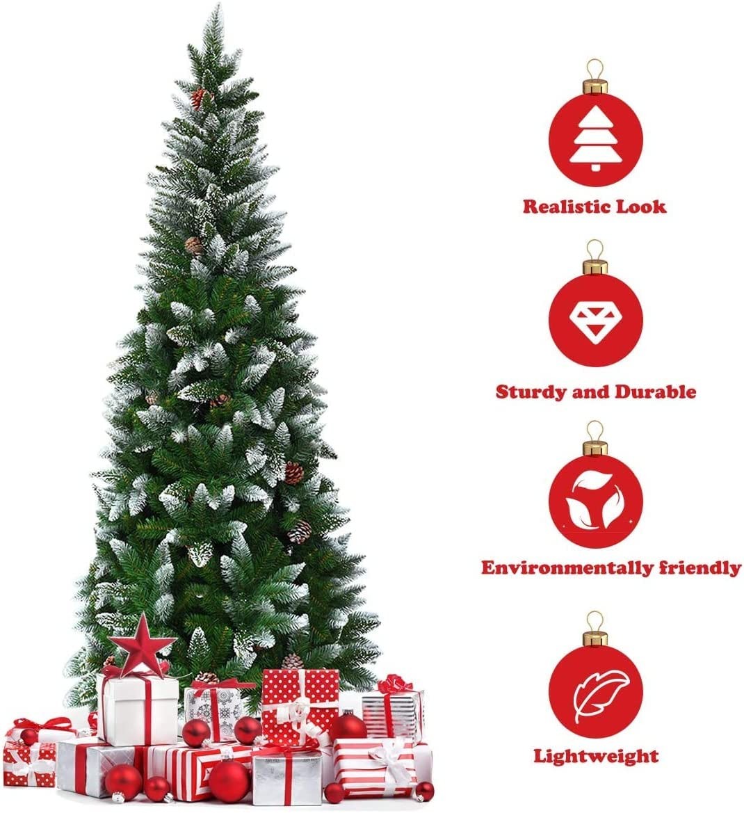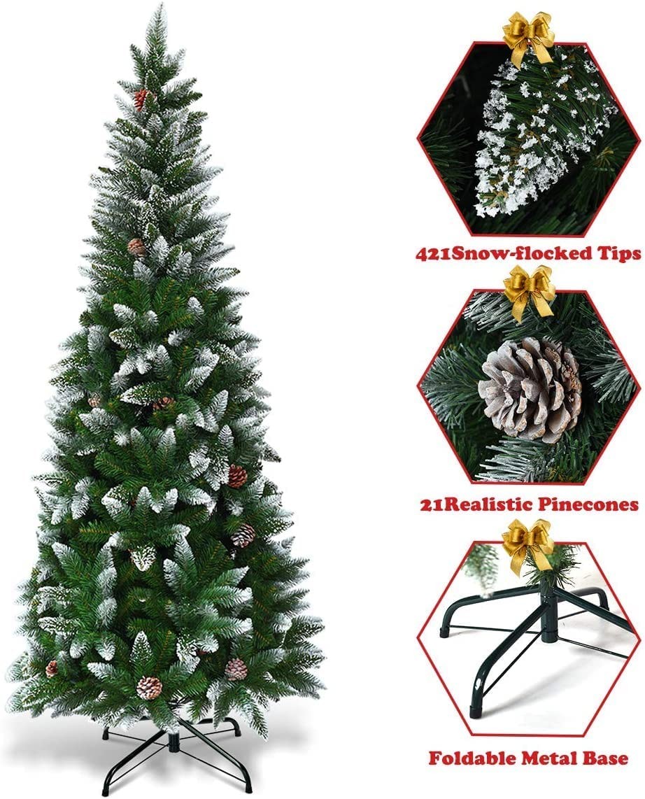White-Tipped Branches with Pine Cones: The needles of this pencil Christmas tree are designed with snow-flocked branch tips, looking ultra-realistic and lifelike to add a loving winter feel to any setting. Pine cones come with white color on the tips, just looking like the snow falling on to create a true and wonderful winter scenery. Quality Slim Pencil Tree: Made of premium PVC material, the flocked pencil Christmas tree is flame-retardant and is not easy to fade, deform and crack. The compact slim silhouette of the pencil tree makes it an ideal accent for foyers, entryways, and corners, thus adding a sophisticated touch to the tightest of spaces. Hinged Construction & Simple Assembly: Adopted hinged construction, the slim Christmas tree is divided into three sections in the package and is easy to assemble, disassemble and store for just a few simple steps. The branches boast an auto-spread design to form a beautiful and fluffy appearance and save you a lot of time. Solid Metal Stand: The unlit skinny slim tree has an X-shaped metal stand. Compared with the cheap plastic stand, the metal stand can provide greater support to improve the overall stability of the tree. Besides, the stand is foldable for storage. The nonslip foot pads of the stand can prevent scratches on the floor. Magic Holiday Decorations: The design of this snow-flocked pencil Christmas tree is unique that can make it a compelling and stunning decoration for any room during the holiday. It is suitable for decorating home, offices, shops, apartments, or commercial places, especially for entryways, corners, and small rooms.