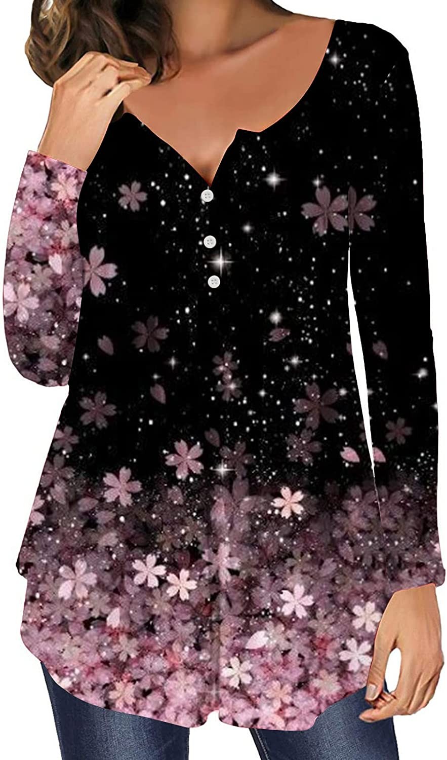 95% Polyester, 5% Spandex Made in the USA or Imported Button closure Machine Wash ♥ Material: 95% polyester, 5% spandex, very kind to the skin, comfortable and breathable. ♥ Feature: Loose style, U-neck with small V-neck, button front design, floral pattern, tunic tops to wear with leggings, womens plus size tops, womens long sleeve tops, long sleeve shirts for women,women tops and blouses. ♥ Matching: Basic shirts,chic,loose fit and comfortable,perfect fall and winter,easy to combine with jeans, shorts, skinny leggings for a subtle look. ♥ Unique Style: The fashionable floral Henley shirt makes this light blouse a timeless fashion that makes you both chic and classic. Folded on the front and back for a stylish design also hide the belly. ♥ Suitable Occasion: Casual/Party/Shopping/Work/Outside/Home/Wedding/School/Holiday Style.Many solid color and floral T shirt available for your choose. Add to your wish list, we will update new color every week.