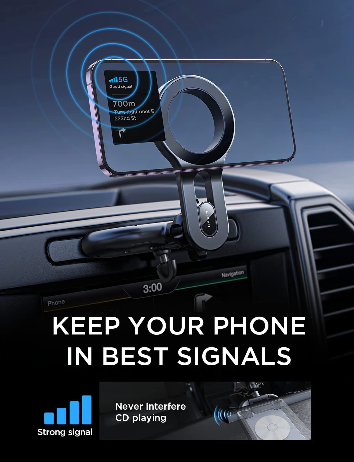 ?ExpertHolder fit for MagSafe: Our Master CD Phone Holder for Car with Non-blocking/Mag safe Function is designed to create the perfect mood for every drivers' experience. With extension arm and free angle adjustment, they can create a comfortable ambience, or a vivid, bright and refreshing driving atmosphere - which suits your car best. ?More Stable, Less Blocking: LISEN has upgraded this magsafe car vent mount from 3 directions.①Upgrade extension arm to protect your phone overheating crash; ②CD Player phone mount with most stable "Steel Hook";③Magnetic phone car mount that has the strongest magnet force, which can hold up to 10 iPhone 13 Pro Max. LISEN provides at least 1 years of user service. ?Protect Your Phone & Vent: This phone holder for for car vent is made of silicone. It will protect your mobile phone and automobile vent from scratches. Enjoy easy navigating, charing, calling, talking or listening to music on this carmount! ?Versatile Mounting: Equipped with 1x CD Clip and 1x Vent Hook, this magnetic phone car mount can be mounted on CD Slot or Air Vent. The triangular support structure CD car phone holder adopts high-quality first-class thickened anti-slip silicone imported from Germany, and the anti-slip index is enhanced by 99%. ❤️️Doing Responsibly and Sustainably❤️As a responsible company, Lisen operates sustainably, to high environmental and social standards. We continue to embed sustainability ever deeper in the way we do business – in our own operations and beyond, together with our suppliers. Lisen cell phone holder for car also comes with 12 months warranty. Our expert team always stands by your side.