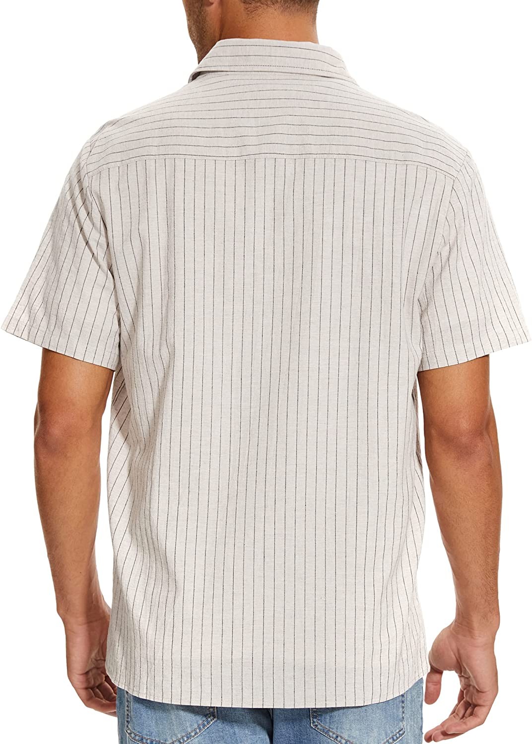 90% Cotton, 10% Viscose Imported Machine Wash Material: Our button-down shirts are made with a blend of cotton and linen, making them soft and comfortable to wear. The fabric is breathable, ensuring you stay cool even in hot weather Design: Our striped shirts come in various colors, catering to different tastes and preferences. Additionally, they feature a convenient chest pocket for added functionality and style Quality: Our short sleeve shirts are well-made and durable, ensuring that they last for a long time. The buttons are sturdy, and the seams are well-stitched Fit: The shirts are cut to fit well, without being too tight or too loose. By offering a range of sizes, you'll be able to find the perfect fit Occasion: Our men's cotton and linen striped short-sleeved shirts are versatile and can be dressed up or down depending on the occasion. With their stylish design and comfortable fit, they are a must-have in any wardrobe
