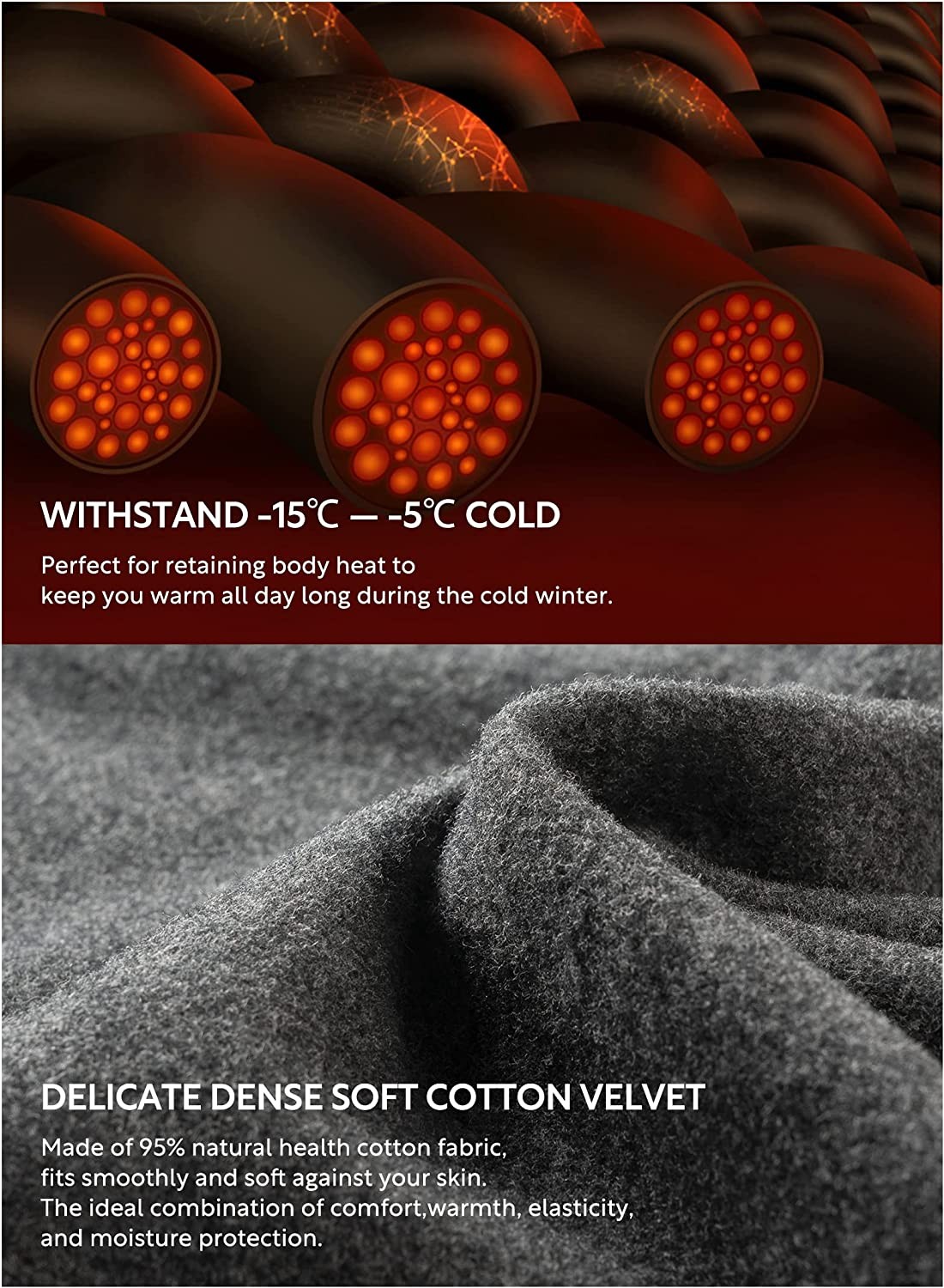 96% Cotton, 4% Spandex Hand Wash Only Stretchy Cotton Fleece Lined Fabric: Premium cotton fleece lined thermal set with spandex stays warm, keeps stretchy, feels smooth soft and stay durable for your winter wearing Double Layer Pouch Design: For providing men's private parts more protection and space, double layer pouch on the thermal bottom reduces most men's rubbing problems and embarrassing adjustments, offers you a more free performance even the outside cold air activities Functional Fly: Considerate design on the thermal bottom with solid fly opening for easy-go when nature calls Crew-Neck Thermal Top: Classic style and stylish neckline designed to facilitate the cover of your neck for providing maximum warm and comfort Versatile Performance: Ultra soft hand feel, heat-retention and comfortable are great to wear at home or add an extra layer of warmth under your clothes
