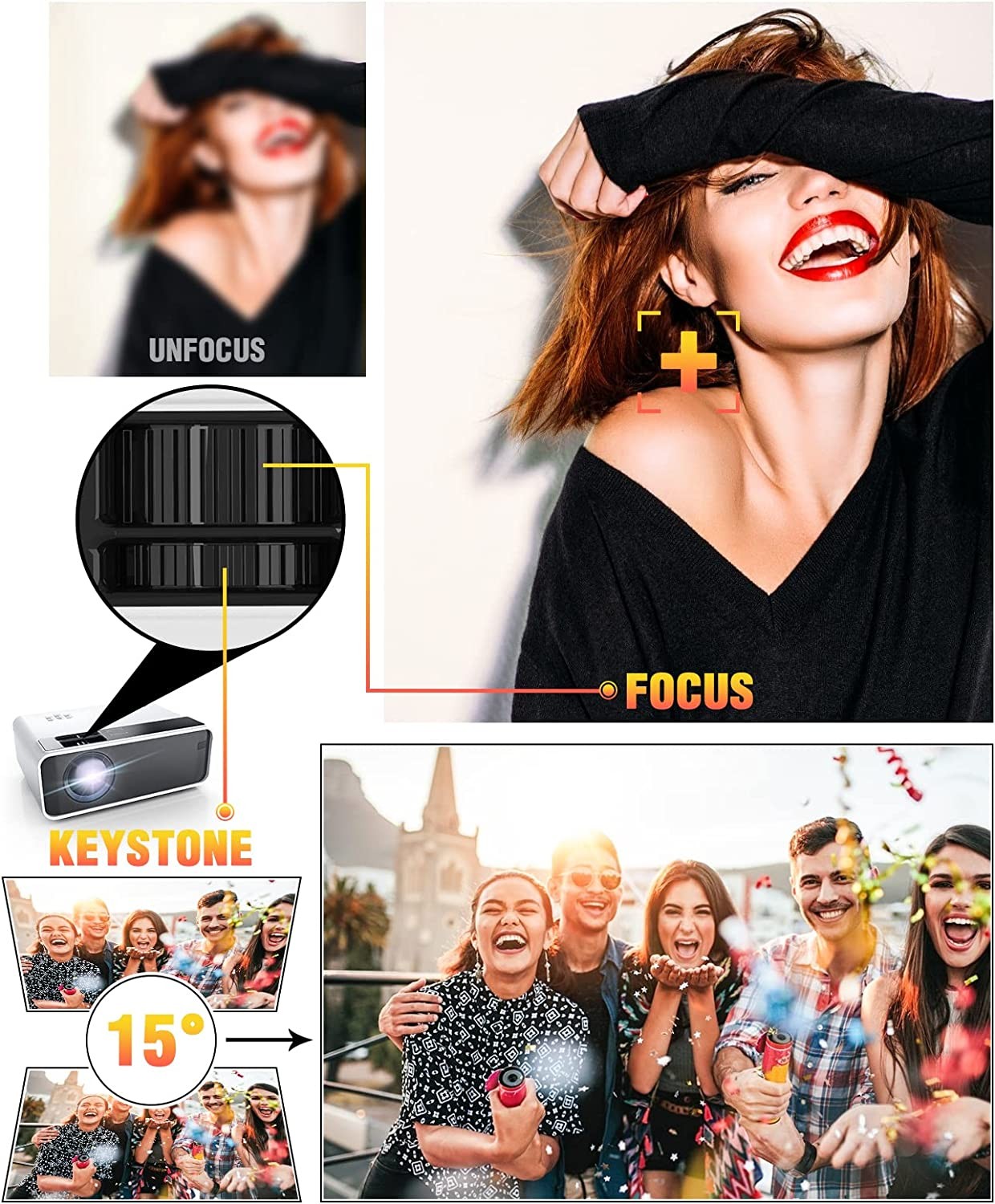 【 PORTABLE DESIGN 】 This portable projector is small in size (7.87 x 5. 5 x 2.7 inch/ 2.25 lb) and convenient for you to take it anywhere. The projector is equipped with the latest cooling system which cuts the fan noise by half, provides a quieter environment for your movie time. ±15° manual keystone correction to meet your different demands.