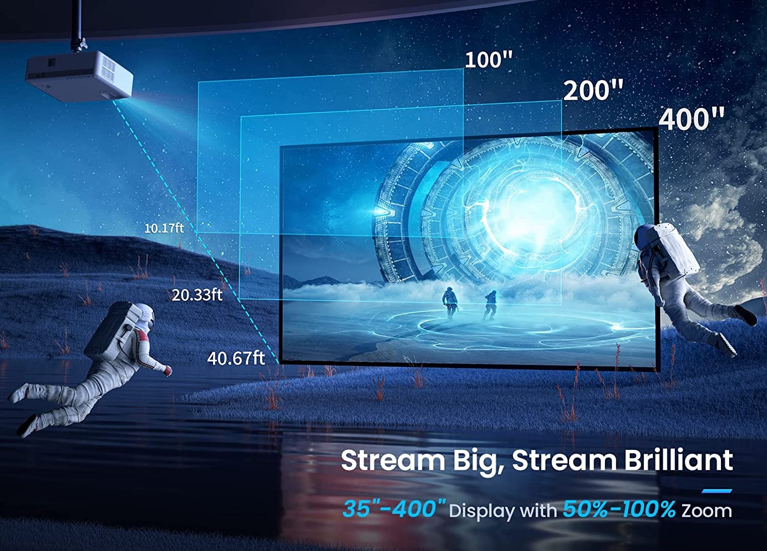 【400” Max Display & 50%-100% Flexible Zoom】From home theater to outdoor movies, our portable projector can provides a 35"- 400" adjustable display with a projection distance between 4-40ft, highly-flexible 50%-100% zoom function, 4:3/16:9 aspect ratio, ±15° keystone correction, and quick focus, assuring that you can get the best viewing experience whether indoors or outdoors. (Exclusive 120 inch projector screen included)