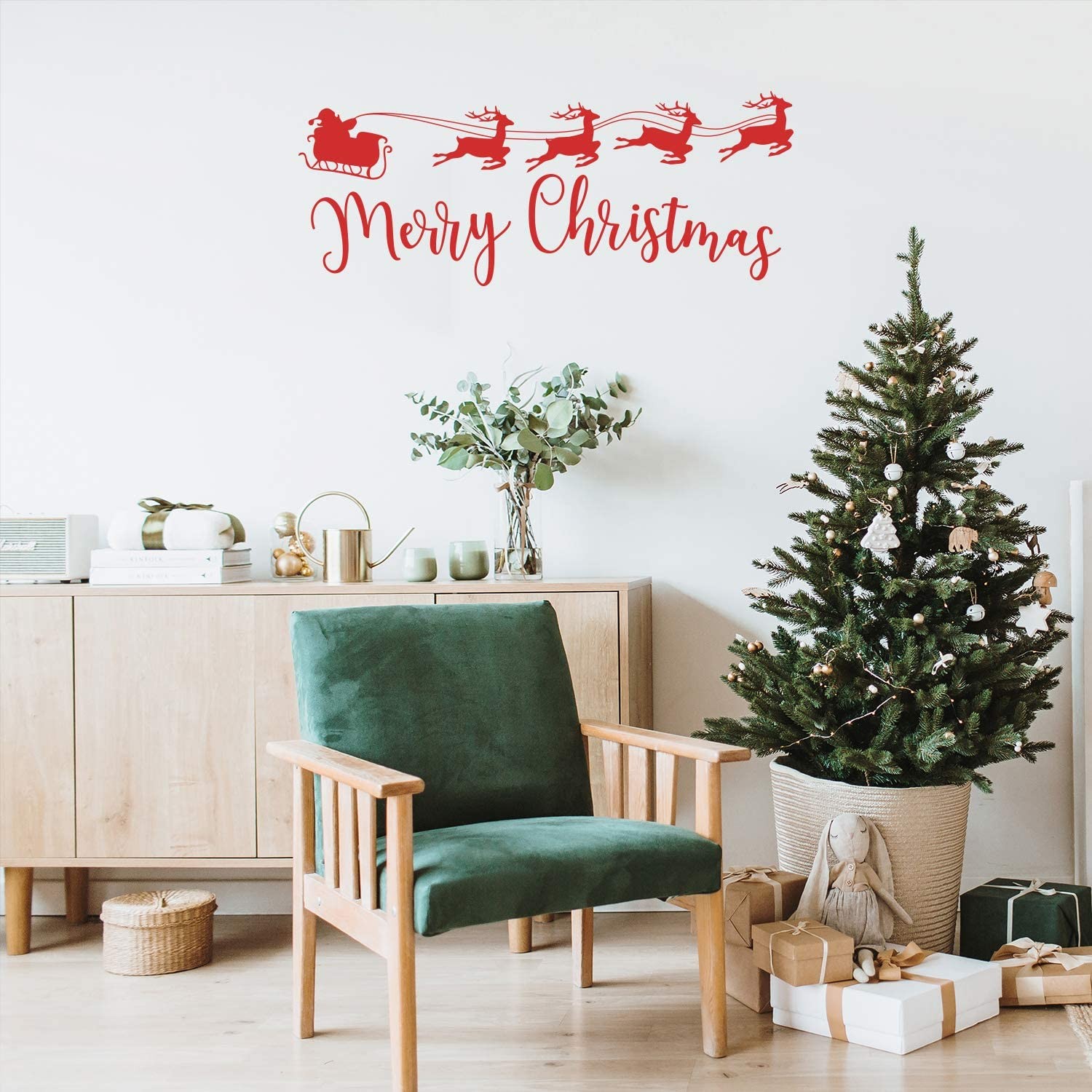 Vinyl Wall Art Decal - Sleigh Merry Christmas - 17" x 42.5" - Reindeer Holiday Season Trendy Seasonal Quote Sticker for Home School Living Room Work Office Classroom Store Window Decor (Red)