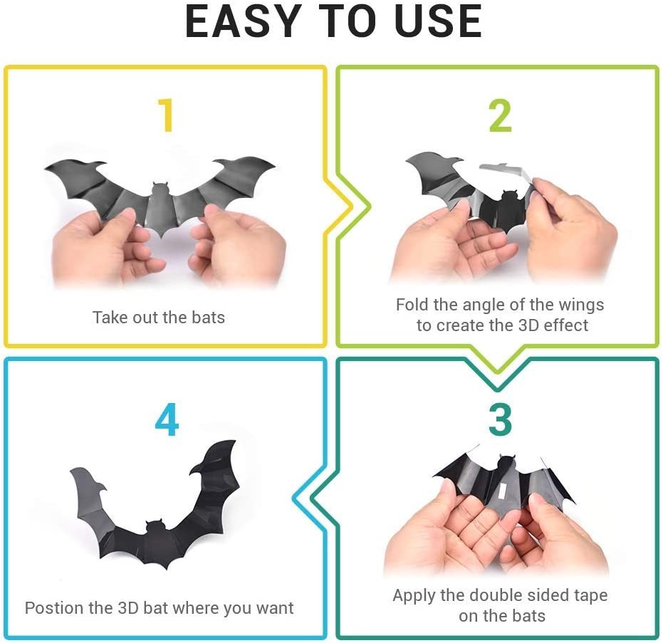 NEWEST & BEST VALUE HALLOWEEN WALL DECOR - Comes with 60pcs Halloween bats wall decor,which is in 3 styles and 4 sizes of each style.Create your own "bat cave" with this 60-piece kit! Scary bat decor all over the wall or window. Arrange them as you wish. You definitely want them in your Halloween Party. VARIOUS STYLES,SIZES & PREMIUM QUALITY - Compared to others,we offer 3 styles of bats stickers and 4 sizes of each style,which makes your walls/doors/glass and other hard surfaces more attractive,creating a more horrible and realistic Halloween scenes.Besides,they are made of PVC material,durable and reusable, you can tear them off when the party is over and store them carefully. WONDERFUL PARTY DECORATIONS CHOICE - 3D decorative bats are great for Halloween parties,school carnivals,Batman-theme parties and easy haunted house decorations.The vivid color and shape are especially fit Halloween scene, adding your room a Halloween mood.One set meets all of you need. EASY TO APPLY - DIY them into different wing angles. Easy to stick. Just stick the item with double-sided adhesive. Fit any smooth and dry surface like painted wallglass ile (REMEMBER to CLEAN the dust before applying). Press firmly onto the surfaces. 100% RISK FREE PURCHASE - We provide 12 months warranty for you to ensure your zero-risk investment.Please feel free to contact us if there is any problem,and we will refund fully if you are not satisfied.