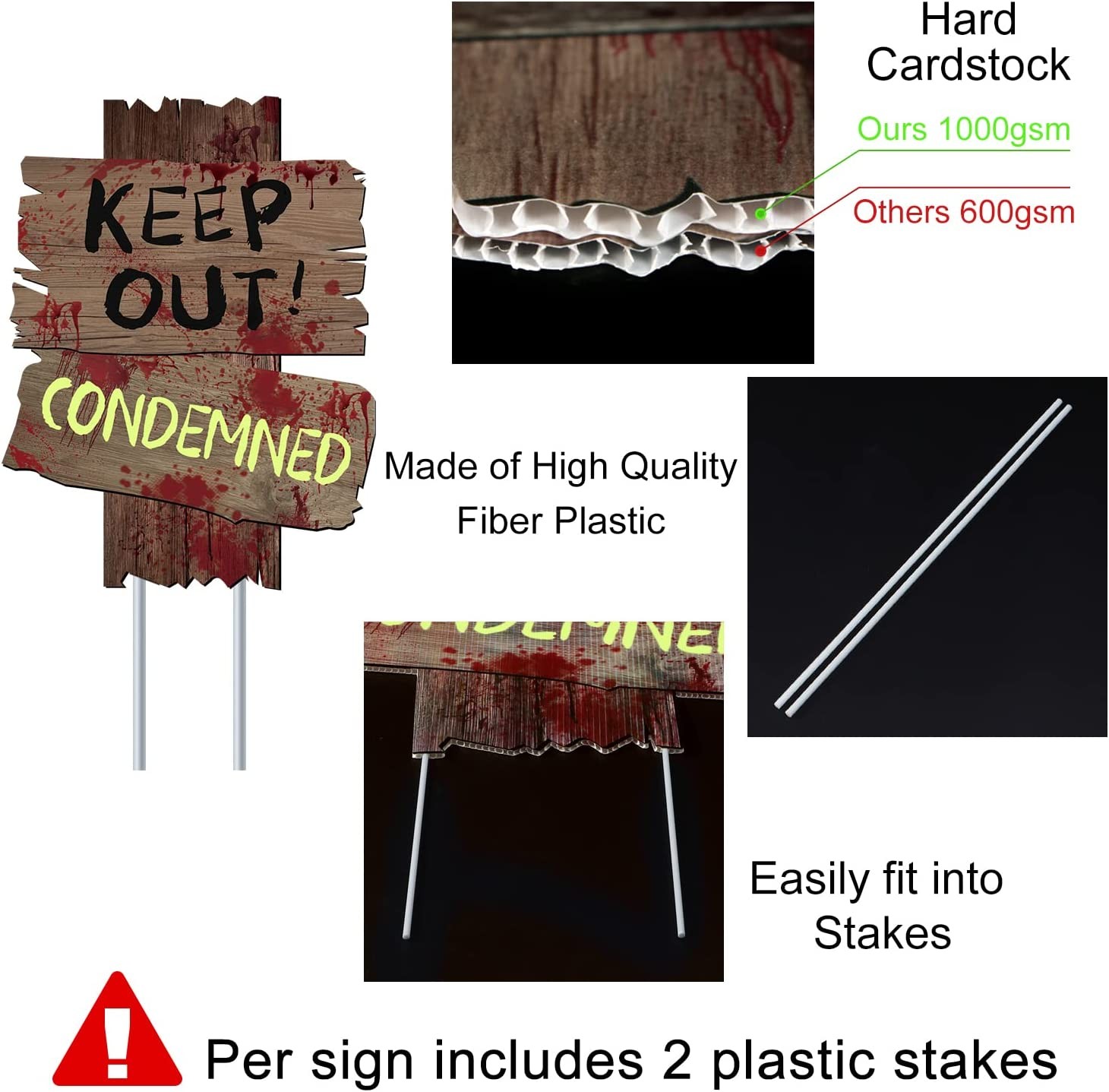 Realistic Halloween decorations:3 Spooky Bloody Warning Signs designed with the spookiest design to ensure a horror spooky scene at your spooky Halloween night Size: Grab your Cemetery Sidewalk Signs available. It is a must have party accessory, 12"x 9" each Sturdy waterproof material: Made of high-quality waterproof plastic. With ground stakes, it is easy to insert the sign hole and fix it to the ground in a few seconds.They will not be blown away, fall apart or break easily Unique Design: These spooky Bloody Cemetery Signs danger. Enter at your own risk beware. Go back. keep out. Condemned Outdoor Halloween decoration: Perfect addition for Halloween party decorations, Indoor Outdoor Halloween decorations, Halloween Display, Haunted House props etc