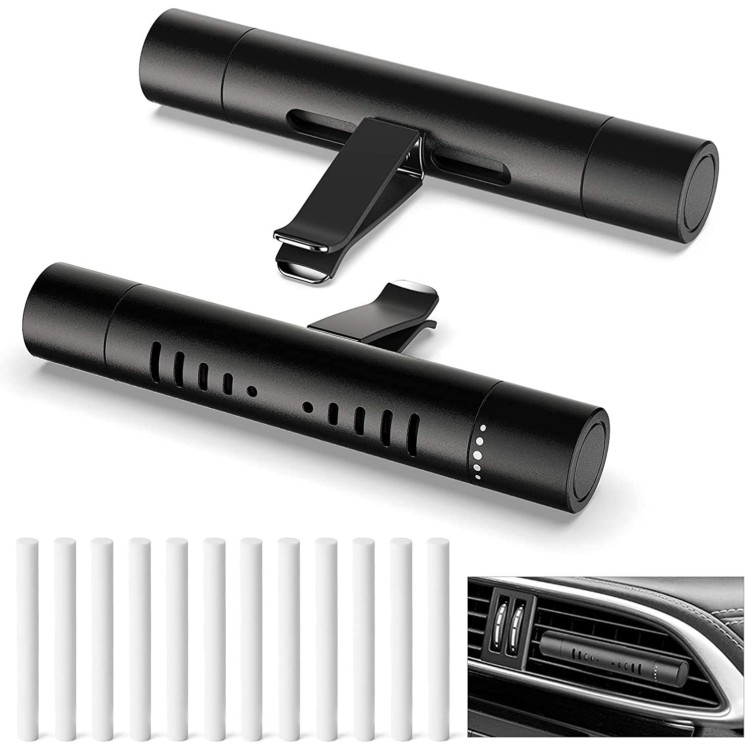[Unique Rotating Design] The top and bottom of our car clips have different sizes of diffuser hole, you can rotate the white dot-marked end to control the concentration of aromatherapy. When you want a faint scent, you can turn off the diffusion port. [More Choice] According to different scent preferences, our car diffuser vent clip has included 12 UNSCENTED refill sticks that absorb and dispense any desired essential oil or perfume with longer lasting fragrance allowing you more aroma choice over your vehicle’s fragrance. [New Exquisite Design] The custom car vent clip designed a newly Long cylindrical type brings you a different Visual effects. Drops your favorite essential oil giving you a joyable mood and slowing down fatigue when you driving. [Widely Compatible] Silicone wrapped clip to avoid scratching the car vent but can clamp firmly.not limited to use in the car, suitable for universal vehicle vents,easy to install.but also for bathroom, office,kitchen,bedroom, pet houses and more [Great Gift] This new car diffuser vent clip packaged with yarn bag and black velvet bag boasts you a nice gift for your family and friends at any occasion.