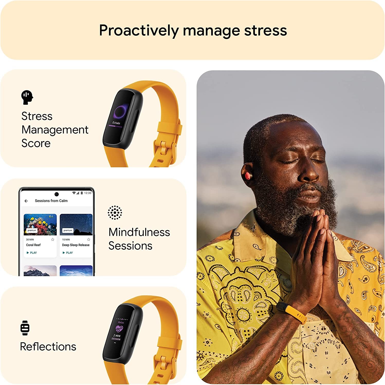 Stress less: always-on wellness tracking, daily Stress Management Score, mindfulness sessions, relax breathing sessions, irregular heart rhythm notifications(2), SpO2(3), menstrual health tracking, resting heart rate and high/low heart rate notifications