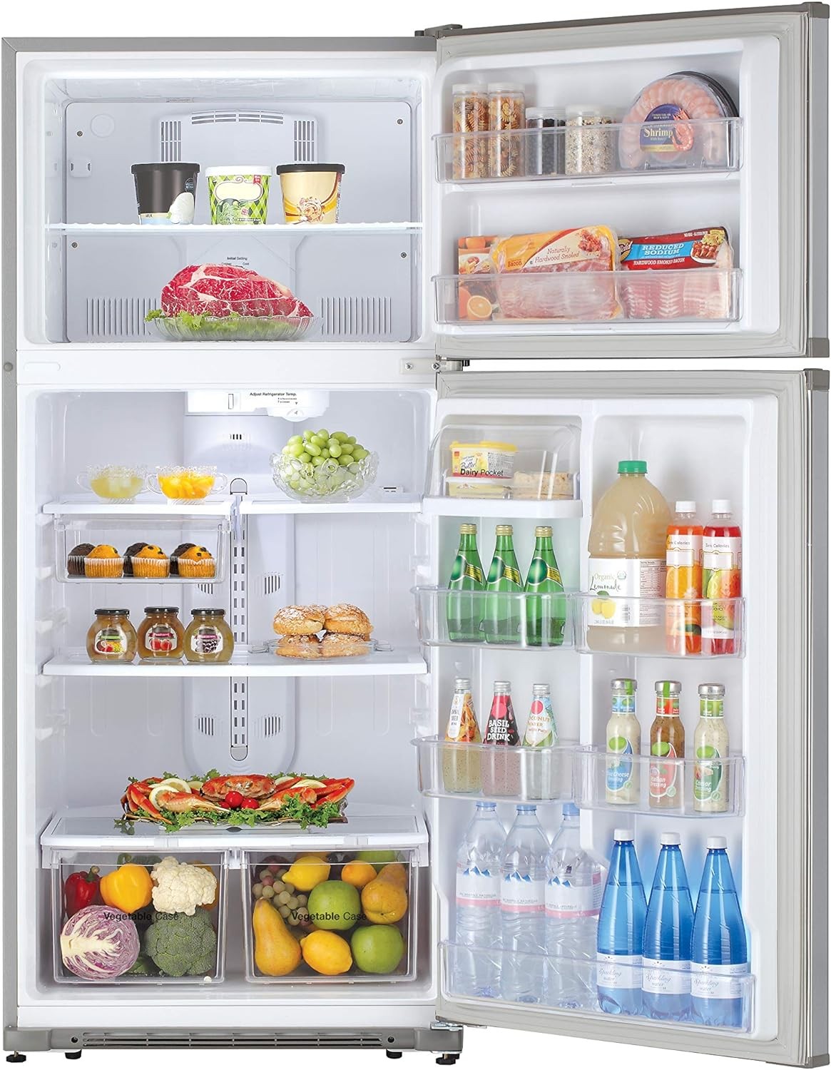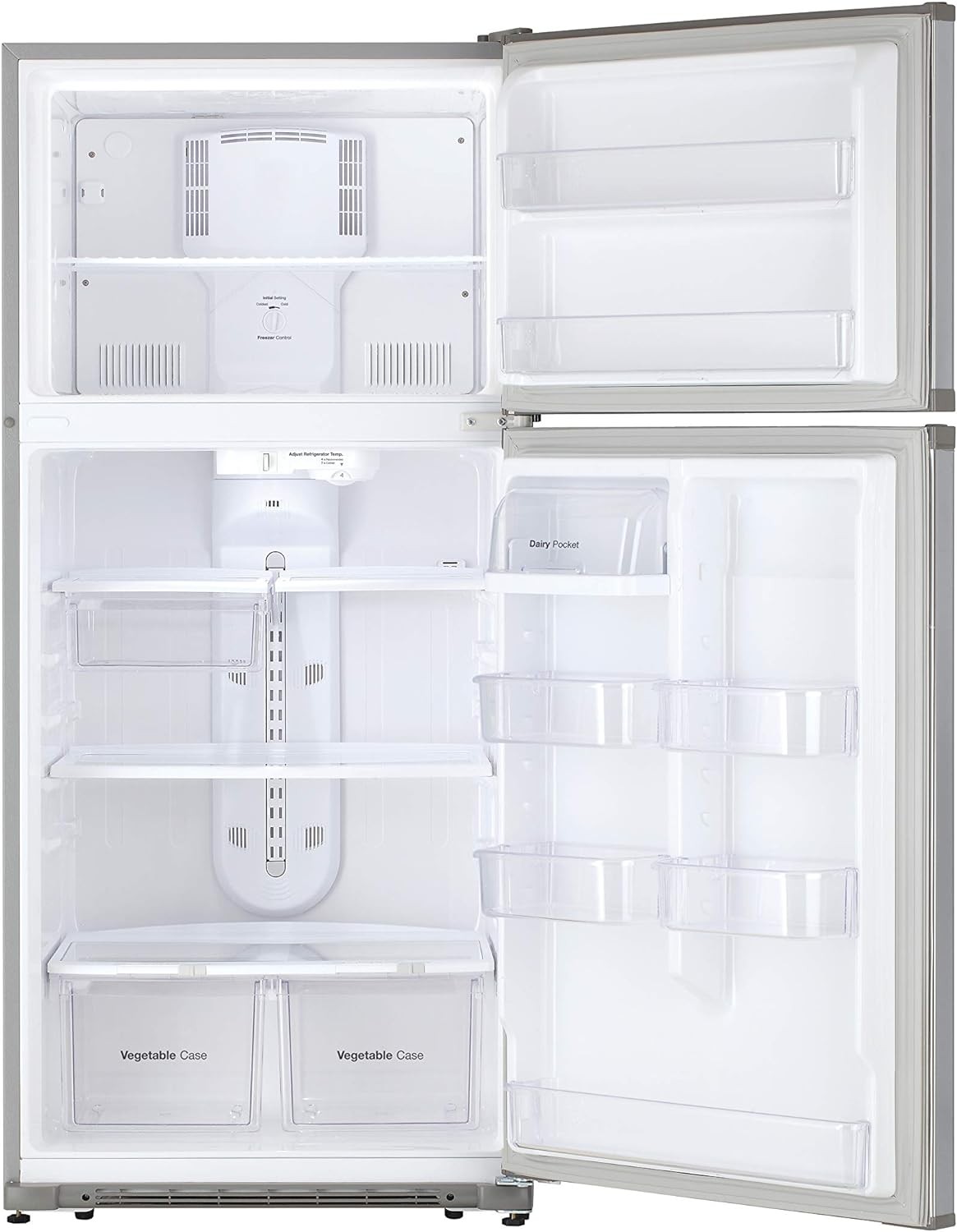 Capacity Extra Large 21 Cu. Ft - Stock-up on groceries with the extra large 21 cu. ft. capacity in a space-saving footprint that is only 33" wide Garage Ready - Garage Ready model complete with an innovative temperature sensor for optimal performance in a wide range of climates Crisper Bins & Humidity-Controlled - Choose the ideal humidity level with Humidity-Controlled Crispers - high for leafy veggies, low for longer lasting fruits Multi Air Flow - Strategically placed vents distribute cool air evenly throughout the entire refrigerator to maintain ideal temperatures in every nook and cranny Utility Drawer - A bonus drawer in the refrigerator allows you to keep snacks, deli items, smaller foods, and other munchable organized and accessible Shelves - Adjustable - Customizable, adjustable shelving throughout the refrigerator and freezer helps keep you organized Dairy Shelf - The Dairy Shelf helps to store items at the ideal temperature to keep them spreadable while the clear cover makes it easy to see what you have on-hand LED Lighting - Energy-efficient, long-lasting LED Lighting casts a warm, natural light on the refrigerator's interior making sure nothing is lost in dark corners Inverter Compressor - The efficiently-designed compressor quickly responds to ambient temperature changes to keep the refrigerator and freezer at the set temperature, so food stays fresh Icemaker(Optional) - Keep your favorite drinks cold by adding the convenience of an Optional Icemaker which can produce up to 00 lbs. of crescent shaped ice per day