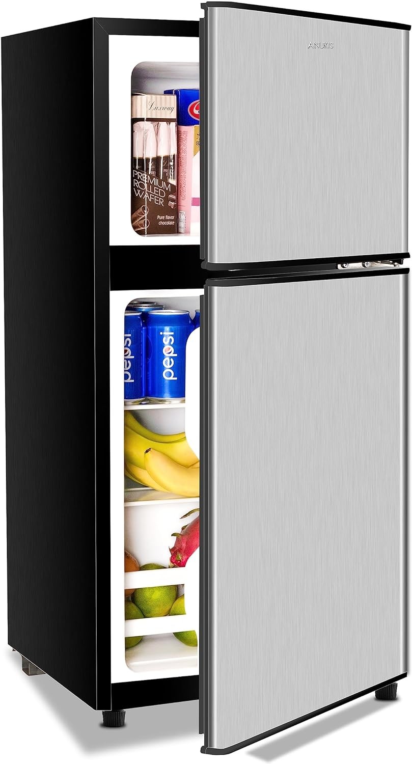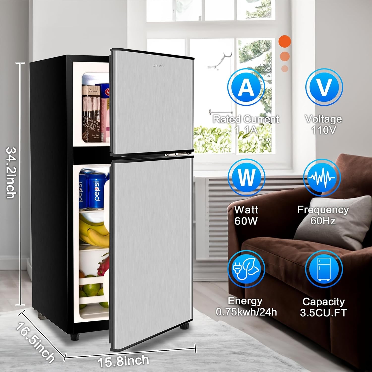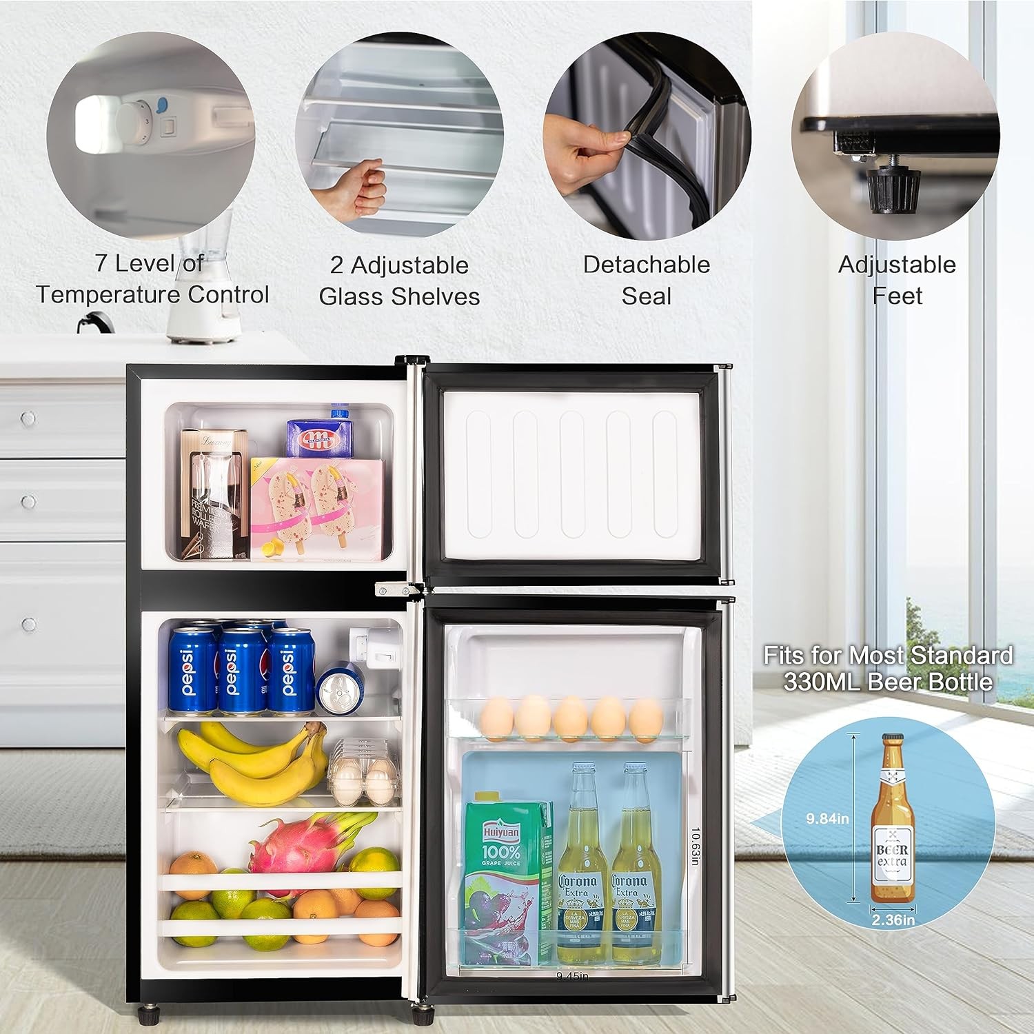 ?????? ?????? ??????: Mini fridge with freezer low consumption power low noise. Suitable for storage of frozen food and fresh food. ?????????? ??????????? ??????: Mini refrigerator with freezer refrigerator compartment 32' to 50' F/ freezer compartment 3' to -1'F. Fresh section: 2.3 Cu Ft, freezer section: 1.2 Cu Ft ?????? ???? ??????: Small fridge with freezer with interior light, the top door for freezer and bottom door. Freezer features ample storage space that can be used to store two 2.4lbs ice cream and some frozen food. Refrigerated space has three parts. The two layers of the glass partition can hold about fifteen 18 oz. cans of drinking water. The bottom layer can hold some fruits and vegetables. ???????? ??? ?????????: Refrigerator adjustable balance of the two front feet of the refrig. ????: In order to make the mini fridge work normally, please make sure to leave it upright for 24 hours before using this small refrigerator.When the thermostat is set at 7 the refrigerator room may ice. Please feel free to contact us If there are any problems, we will try our best to make you satisfied!