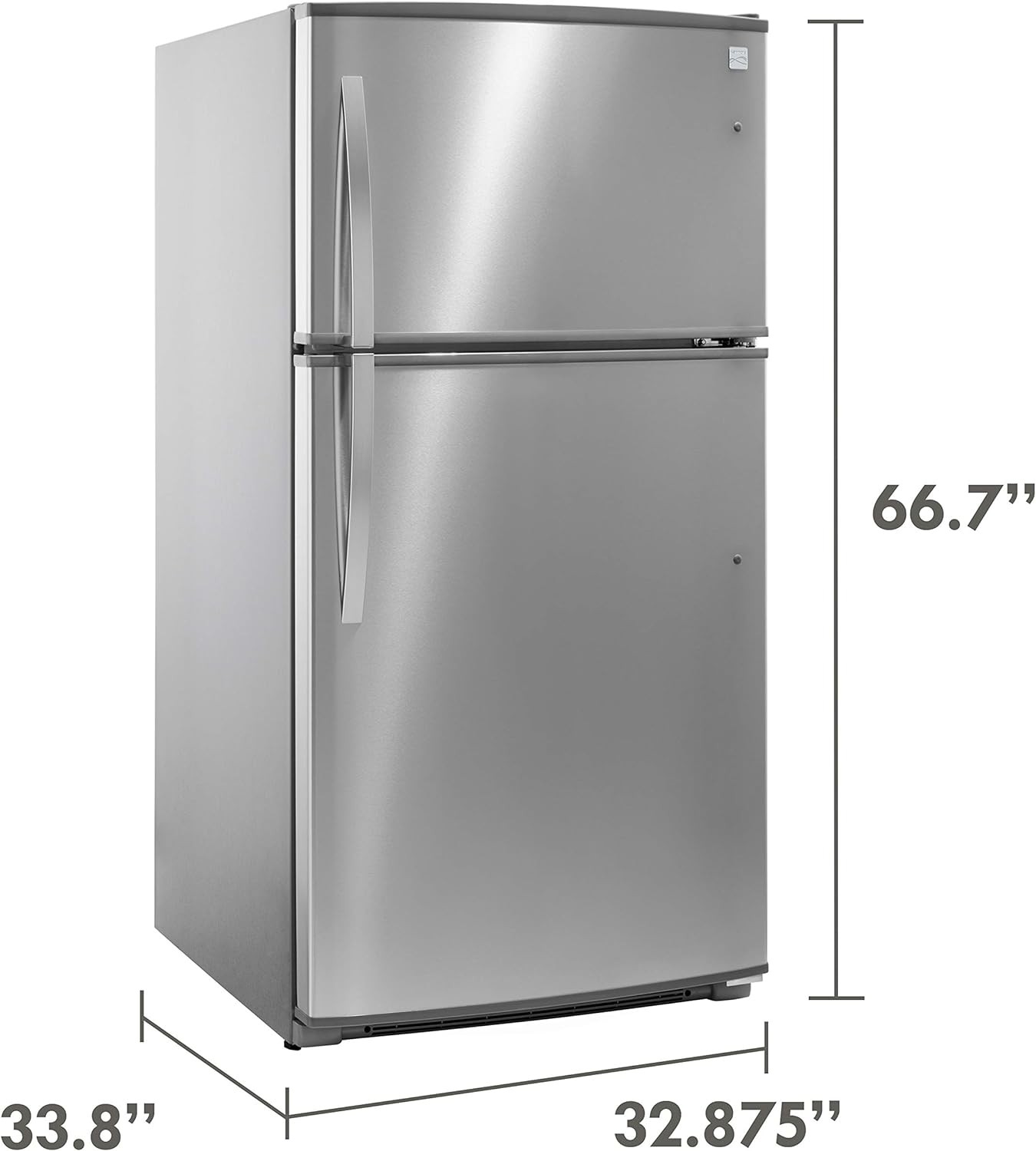 FREEZER AND REFRIGERATOR COMBO: 20.8 cubic ft. top mount freezer refrigerator with two crisper drawers provides ample storage for fresh and frozen items EASY ACCESS SHELVING: Features slide-out glass storage shelves for easy access and removal of pies, cakes, casseroles, and larger food items, as well as LED lighting for a warm, natural light CONVENIENT STORAGE: Adjustable, easy to remove shelving customizes your storage space, while gallon door bins provide space for taller and wider food or beverage items LOW MAINTENANCE, HIGH PERFORMANCE: Clean back design hides condenser coils, preventing the accumulation of dust and providing you with better refrigerating performance and less maintenance IDEAL SIZE: Measures 33.8" x 32.87" x 66.1" for the perfect amount of versatile food storage space in your home, office, or garage