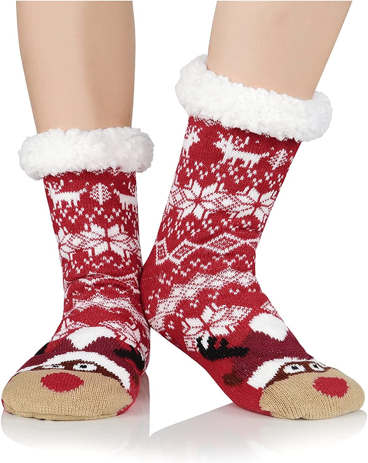 HIGH QUALITY SOCKS: Women fleece-lined knit socks are made of Acrylic and Polyester, warm, breathable, extremely soft and cozy, no itching issue. Super thick fleece lining and soft touch features will make your feet feel comfortable and keep the feet warm. This kind of cozy and fluffy plush socks is suitable for you all day foot wear. FUZZY FLEECE-LINED SOCKS: Women winter socks are designed with thick fleece lining and knitted surface to keep your feet warm, assured your feet comfortable, awesome cozy and breathable. Vintage and trendy design thick warm women's winter socks that will coordinate with whatever you're wearing. KNITTED NON-SLIP SOCKS: Our anti-slip fuzzy socks for women with grips at sole of socks, the superior grips are premium made and designed to grip on any surface to help reduce slips. Prevent falling or losing balance while walking or running. Women winter socks are designed with thick materials to keep your feet warm and healthy during cold weather is important to your overall health. PREMIUM FUZZY SOCKS: Our women's fuzzy slipper socks have strong elasticity and can be stretched, one size suitable for most women and girls. They are elastic and perfectly make it suitable for your feet. Please do not iron them, suggesting wash them by hand and wash before wear. High quality socks require the proper care. PERFECT SOCKS CHOICE: Our non-slip grips socks will be perfect for activities like running, yoga, Pilates, or just to walk around the house all day long. Our socks applicable to many occasions, casual, various events, wear to work, home, sports. The fuzzy socks make a great gift for your loved one and your family. Perfect for holiday gifts as Thanksgiving, Christmas, New Year, birthday for your partners, girlfriend or your daughters.