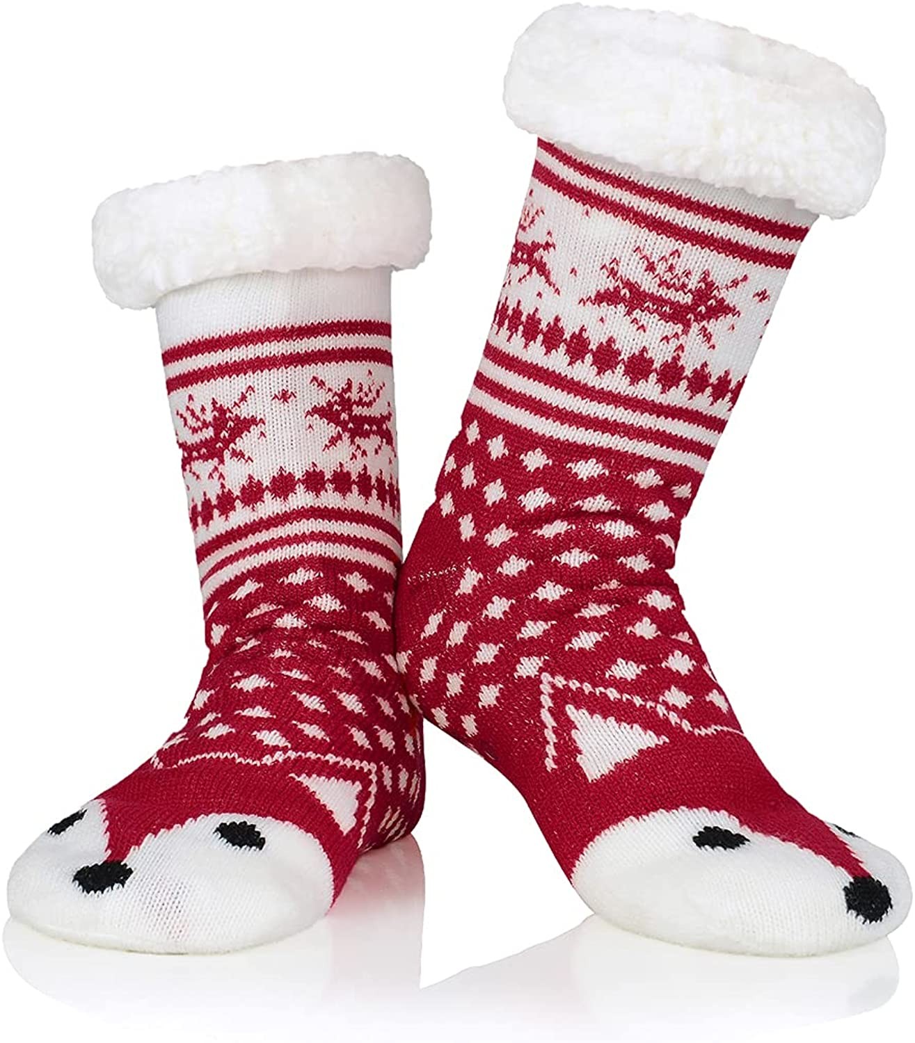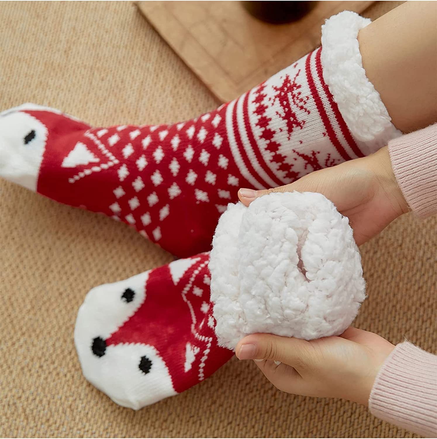 Soft Material: Women fluffy socks are made of high quality fabric, soft, warm, elastic, comfortable, breathable and lightweight. These slipper socks are so soft that you will fall in love with them if you wear them just once. Soft cloud-like fluffy material will keep your feet and toes warm on cold mornings. Warm Thick Plush: The outer surface of the slipper socks is knitted and the inner is full of thick plush. Socks are above the ankle to protect your whole feet from coldness. Thick material will keep your feet and toes warm in cold days. Cozy socks are elastic and one size fit most women and girls. Non Slip Grip: Dot grips at sole of socks provide friction on slick surface such as wood floors, tile floors. Prevent falling or losing balance while walking or running indoors. Perfect companion yoga pilates house socks allows safer practice, fall prevention and enhances balance during sports exercise. Winter Colorful: Each pack including one pairs of sliper socks. Socks are made from premium materials to provide a luxurious look. There are many combinations of socks for you to choose from snow, deer, fox, Christmas style and many other cute animals that can satisfy your preferences. Slipper Socks Gift: Super soft fuzzy socks make the perfect present for home wear, daily wear, holiday wear, maternity, hospital, sleep, and outdoor wear. You also can choose for your girlfriend, daughter, wife as birthdays Christmas gift. And we suggest hand-washing to longest sock life.