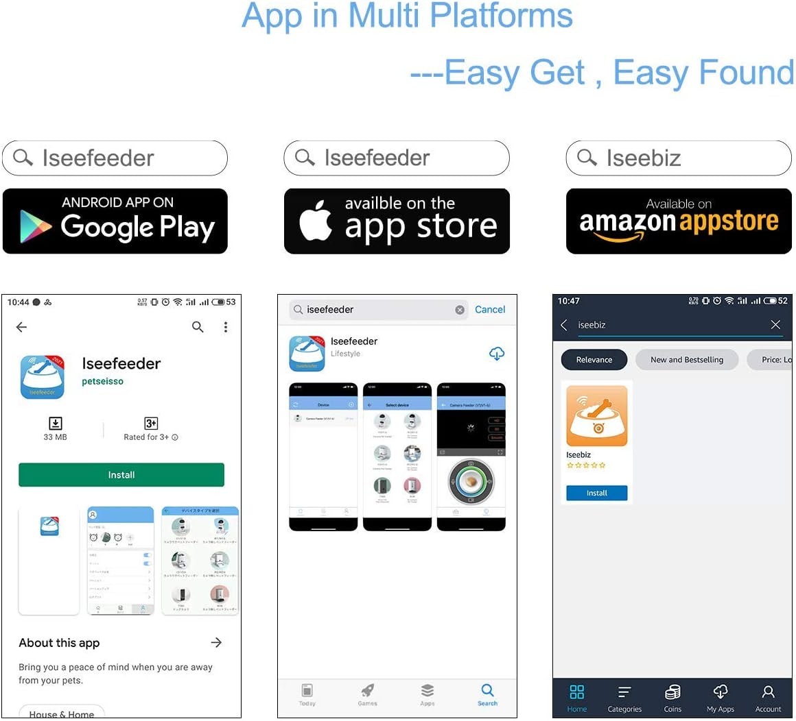 ➤【Customize Feeding Portion】 The Iseebiz Smart Feeder provides up to 8 meals a day, flexible meal portions from 1 to 20 portions per meal, 5g for each portion, and the container capacity is 3 litre, could hold enough dry food for your fur kid. Feeding Reference: 1 cup of food is about 24 portions. ➤【2-Min Easy Setup】 1) Plug in the power adapter 2) download the Iseefeeder app 3) type in the account and password of your home wifi network(only 2.4GHz)【No camera, no need to scan QR code】. Then control your feeder by Iseefeeder APP on your mobile device anytime anywhere. You could also add a snack through your phone when you are home.【If you need the CAMERA version, check ASIN: B07QCT34D5】 ➤【IR Detector + Voice Record】 For your pet’s happy meal time, the IR detector prevent the pet food from clogging or overflow. Just be aware that the size of the dry food should not exceed 1 cm³. You could record 10s feeding voice, your personal sound will keep your pet not alone. For not annoying you or your family, the sound is low, but your fur kid could hear the lower sound than we could. ➤【Battery Backup Power Supply】 The feeder can be powered by 3 type D batteries (not included). With batteries as backup, they could keep this low energy consumed feeder work for more than 3 months, no worry about power failure when you are not at home. 【In batteries-only mode, the feeder will feed your pet according to the schedules you set before, but functions in APP and Wifi function will not work】. ➤【Easy Get App】At the request of customers, we released the new app "Iseefeeder" in Google Play and Apple app store, "Iseebiz" in amazon Appstore. You could still also install the "Iseebiz" in Apple app store. Watch and play with your fur kid anytime anywhere.