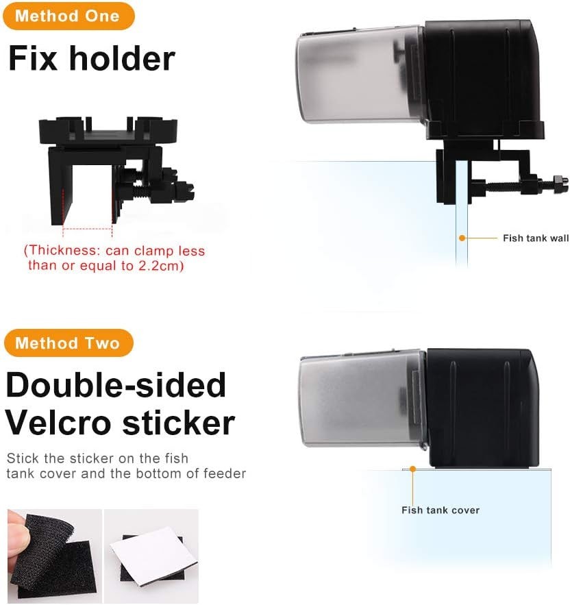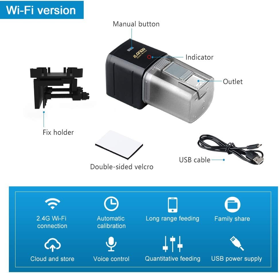 ? Wi-Fi APP (over 16 languages support, which suitable for user in worldwide) remote control supports – Accurate feeding time and countdown feeding time (maybe about 30 seconds delay) can be set. Best choice for daily used no matter you are not at home, at work, on weekend or on vacation. ? Time obtains & servo system - Automatic obtains the global local time and calibrate. The servo system will start automatically and continue to feed according to the feeding time which had been set before, when the network is disconnected. ? Feeds and fish tanks - The discharge port is adjustable which suits for a variety kind of feeds like pellet, particle, flake and small strip. Two kinds of easy installation methods (fixing clip and double-sided velcro). ILONDA fish feeder for aquarium fits small, medium and large fish tank. ? Intelligent feeding protection – When power off happens, the feeder will stop working to protect your fish. Because the filtering system, circulatory system and purification system will stop at the same time which may cause loss of appetite for fish. If the feeding still continues, which may increase the eutrophication of water and release of ammonia nitrogen. It will hurt your pet fish. ? USB power supply & manual feeding function – easy to get USB power, no need of battery. After you connect the USB power, you just need to press down the button on the feeder or in the APP (need to connect the feeder by Wi-Fi), it will rotate a circle with 360° for feeding.