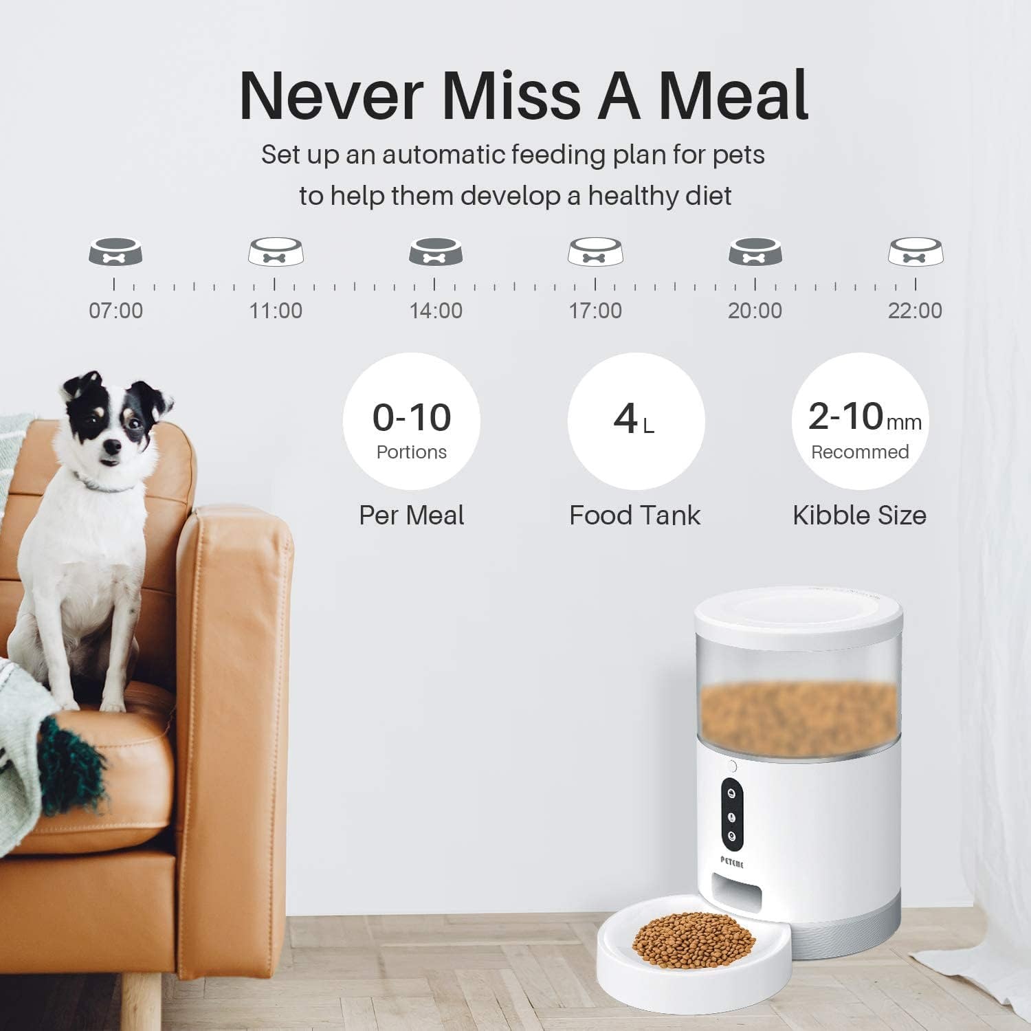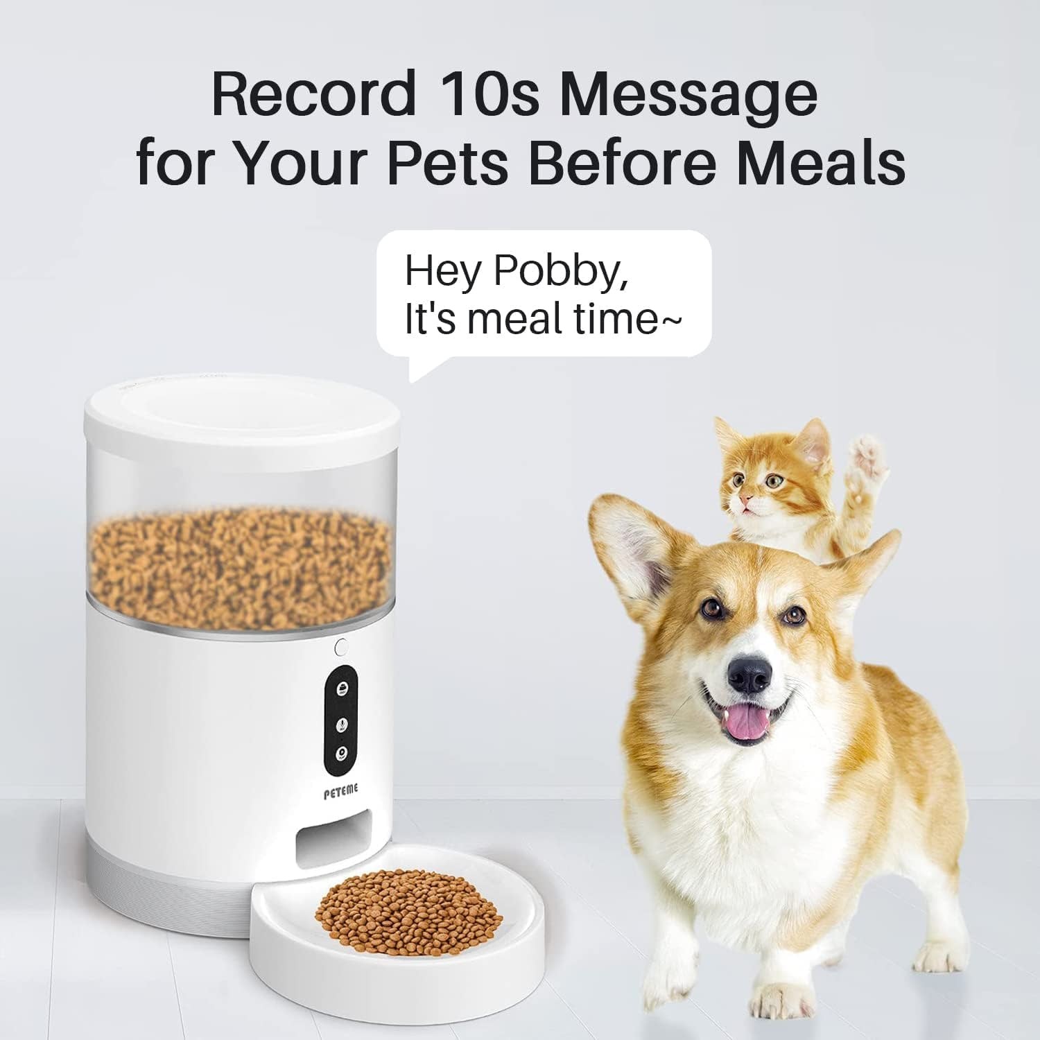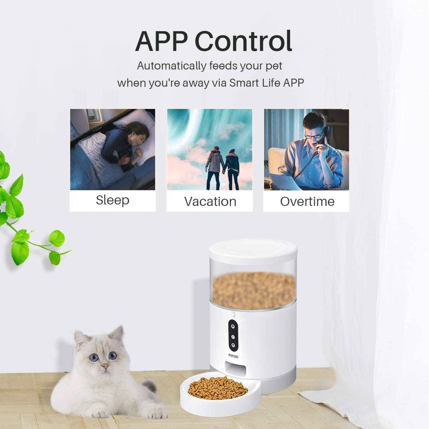 ?【APP Smart Pet Feeder】 4L automatic cat feeder is intelligently controlled by APP. Don’t worry about your pet’s health when you need to travel short distances and work late into the night. Note: WiFi network must be at 2.4GHz frequency for pet feeder to work normally, 5GHz is not supported. ?【Various Component Options】 The feeder is only suitable for 2-10mm dry pet food. The timetable for providing pets is up to 6 meals, with 1-10 servings per meal, and each serving is about 8-10 grams. You can develop a personalized meal plan for your pet to prevent your pet from overeating. ?【Recording function】 Personalized recording function, call your pet when food is distributed. Let it know that you are by its side and will not be sad because of your leaving. (For example, hey buddy, come on, it's time to eat!) ?【Dual Power Supply Battery Life】 The automatic cat distributor has dual power supplies. Use a 5V DC adapter and 3 alkaline D-type batteries (not included) for power supply. In the event of a sudden power failure, the feeder continues to work on batteries. Make sure your pet continues to get food. (Set with memory function to prevent sudden power failure) ?【Easy to Use and Clean】 All parts can be disassembled and rinsed with water (Except the host), and must be wiped dry before assembly. The translucent storage slot allows you to clearly know the amount of food. Place the feeder in the corner of the wall to prevent it from tipping over.