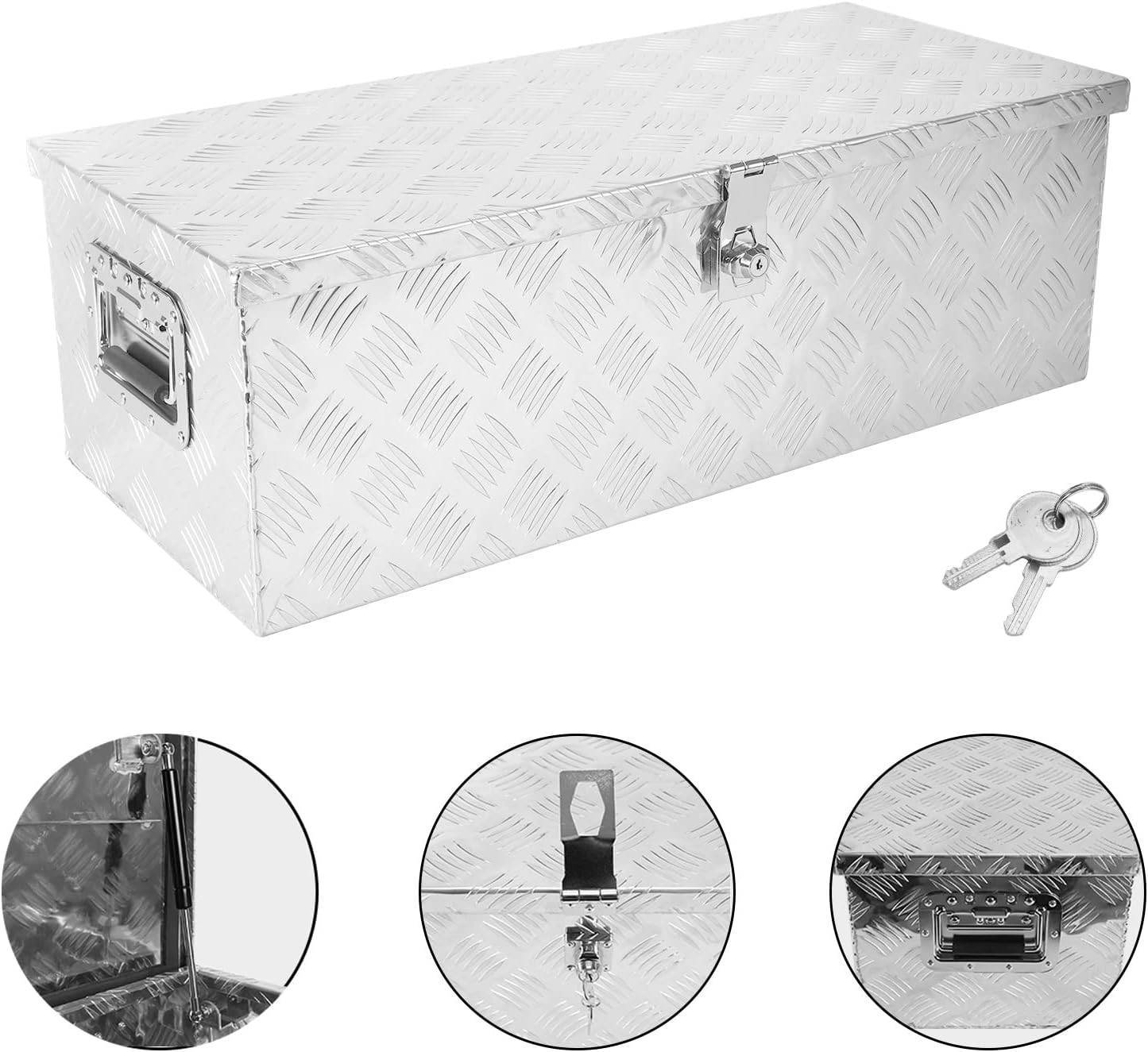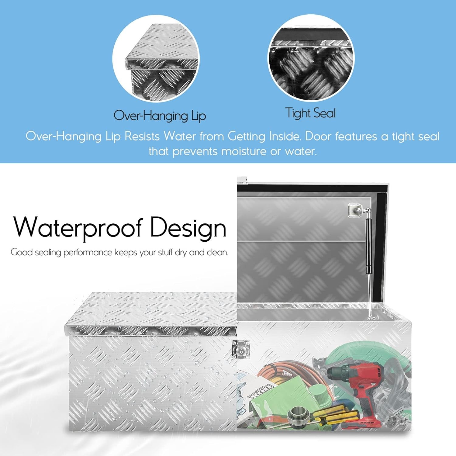 [Ideal Storage Box for Limited Space]: This tool box is constructed of heavy duty textured aluminum for maximum durability. The door features a over-hanging lip which resists water from getting inside.