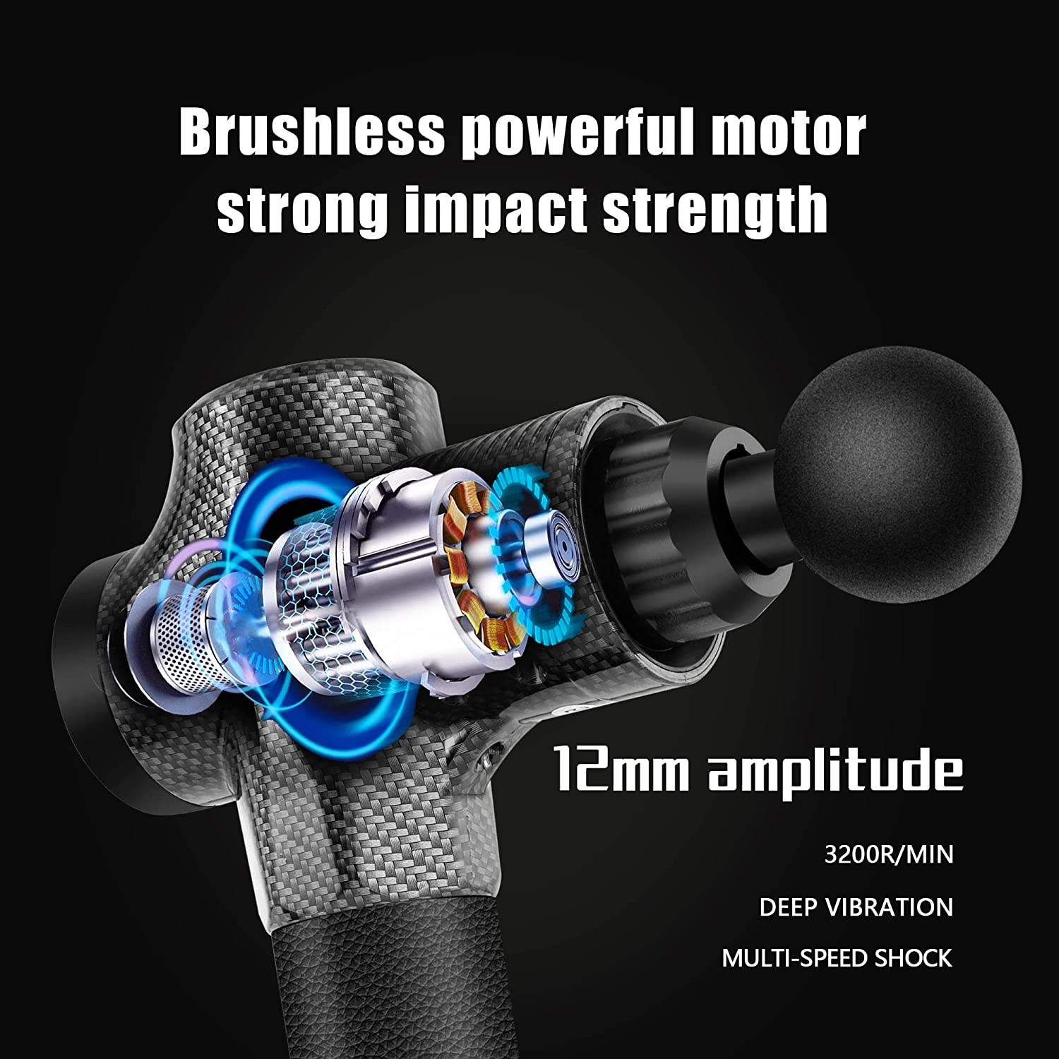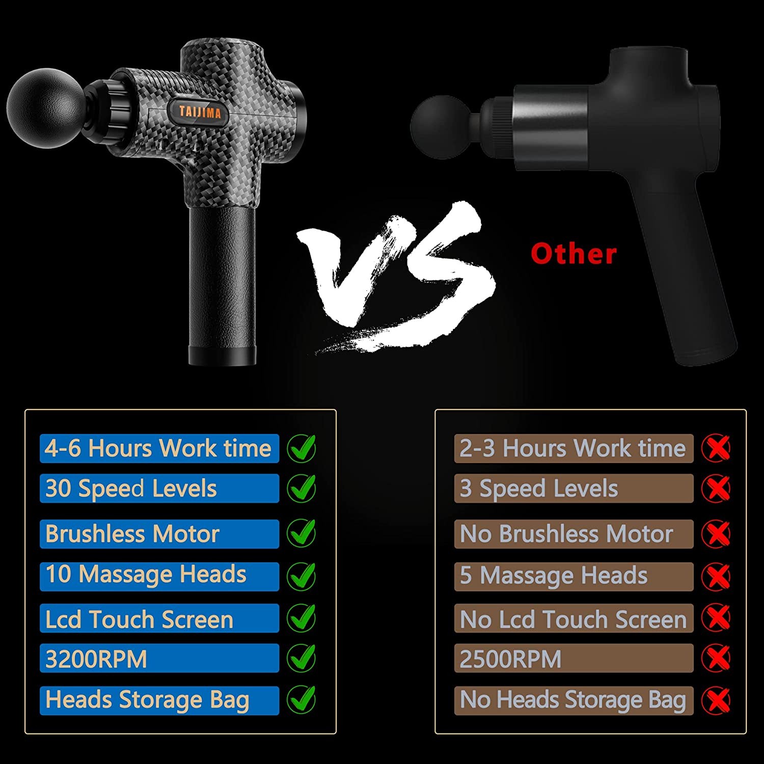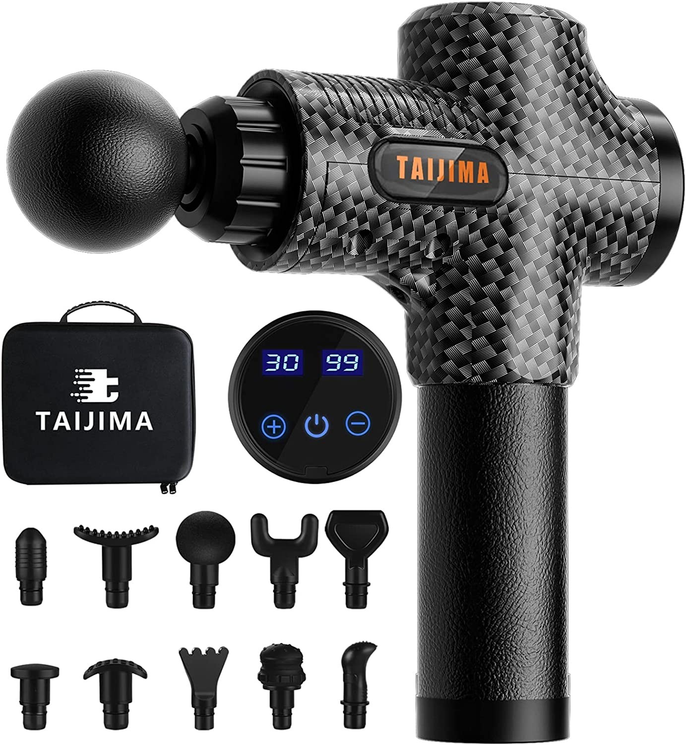 Deep tissue massage gun, TAIJIMA massage gun can effectively relieve muscle fatigue and pain, promote blood circulation, relieve lactic acid, whether it's a muscle relaxation after exercise or a daily body massage, you can easily find the vibration amplitude that suits you best Muscle massage gun, 10 replaceable massage heads help users relax all parts of the body, which will provide you a different massage experiences Cordless massage gun, 30 speed modes, every minute sends high-speed pulse of pressure to your muscle tissue, speed levels up to 3200 rpm, this massage gun helps for tight muscles. LED touch screen allows you easily change the speed as you wish Super quiet massage tool, the 2500mAH capacity battery and the high-torque motor and unique quite glide noise reduction technology that brings high power but low noise (35dB - 55dB) experience. you can use it at home, gym, office, etcE Handheld percussion massage gun, the Portable handheld massager weighs about 1 KG, the ergonomic silicone handle is better for gripping, and prevent slips and falls from hand.
