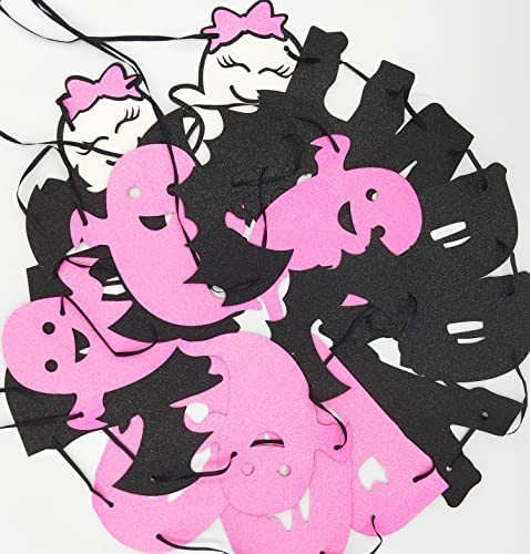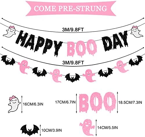 WHAT YOU WILL GET - 1 pieces pink black glittery happy boo day Banner, one says glitter "HAPPY BOO DAY" with white ghost signs, the other is bat and ghost pattern banner, perfect to add funny atmosphere for your Halloween birthday party. PINK BLACK GLITTER BANNER - Each letter height approx is 6.7 inch / 17 cm. The Bat sign height is 3.9 inch /10 cm and the ghost height is 5.5 inch / 14 cm. Each banner string is 3 meters / 9.8 feet. High quality pink black glittery paper card and black satin ribbons, make your Halloween birthday party more unique! NO DIY REQUIRED - You can decorate with ease as it comes pre-assembled which means you just only need to hang it on the mantle, wall, ceiling, over your cake table, on tree or on the entrance door to trigger the excitement. Each cards are cautiously made and can be moved to your ideal distance! HALLOWEEN BIRTHDAY PARTY DECORATIONS - Suitable for Halloween birthday or baby shower party decorations, Halloween ghost themed fireplace, mantle, wall decorations. Brilliant decoration prop for Halloween to create pleasant and warm atmosphere. UNIQUE HALLOWEEN BACKDROP - Perfect for hunging from branches and ceilings, or open against a wall, hanging up dessert tables, the adornment of the integral collocation of color is also very perfect place. Perfect for girl Halloween boo day party decorations.