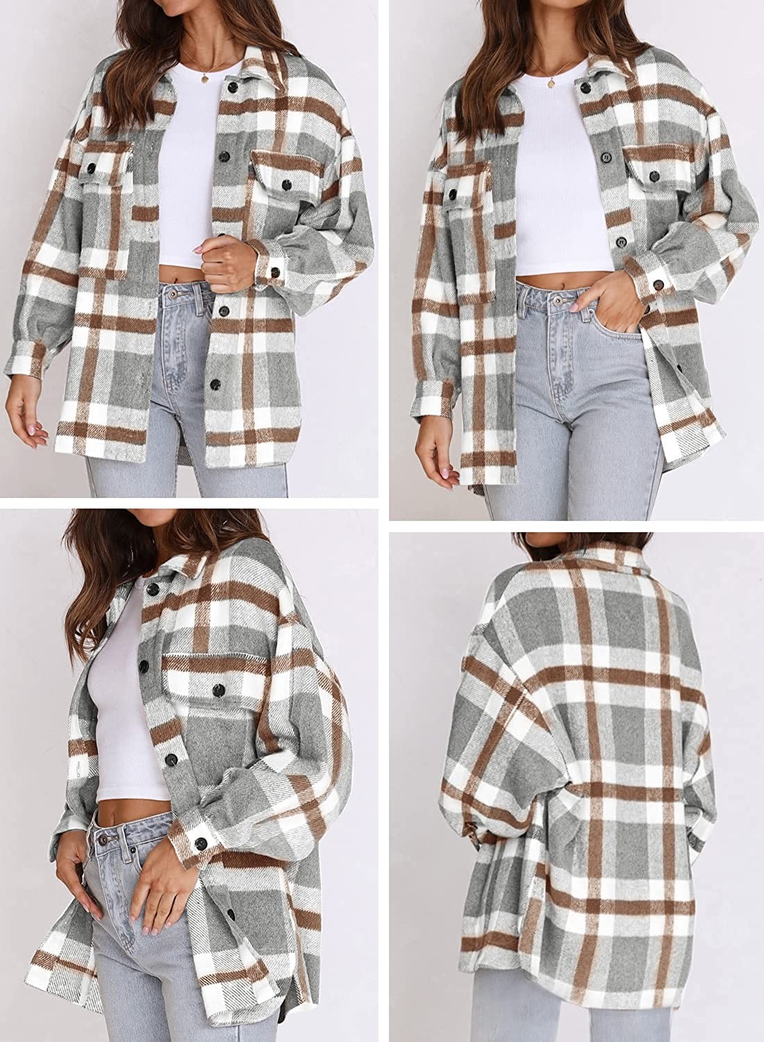 [Feature]-The flannel jacket,Button front top,plaid print,Scoop hemline,Two flap chest pocket,Single button on cuff,Soft fabrication,Oversized fit,Drop shoulder,Unlined.