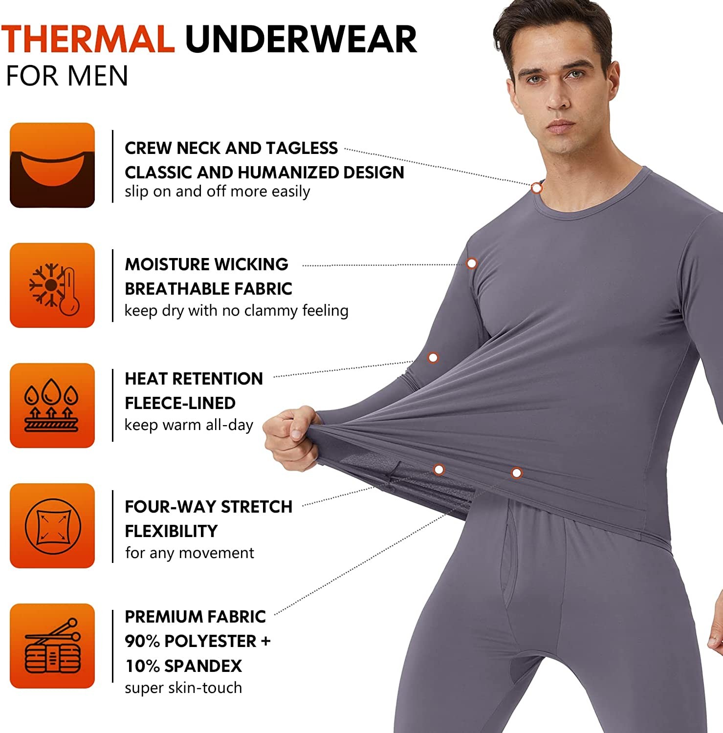 90% Polyester, 10% Spandex Imported Pull On closure Machine Wash ULTRA SOFT AND SUPER WARM: CL Convallaria mens thermal underwear set is made of 90% Polyester / 10% Spandex blend fabric with high density fleece lined, the insulation material which can lock your body heat well. The super skin-touch and ultra soft long johns for men fit snug like a second skin for minimizing heat loss and keep you warm in the cold winter. STRONG MOISTURE WICKING(WITHOUT THE SWEATY MESS): Our fans say the unique breathable, moisture-wicking fibers on CL thermal underwear will wick away moisture to keep you dry with no sticky or clammy feeling so you can wear them all day for your work or snow adventure. The smiles on men's faces will tell you how satisfied with this thermal underwear set. 4-WAY STRETCH INSULATED UNDERWEAR: While adopting the design of the Four-way stretch, we improved the crotch and armpit according to the feedback of market customers. make the reach and squat more comfortable while retaining excellent elasticity and durability for maximum mobility. CL uses high-quality stitching for thermal leggings and long sleeve shirts to beat super-active days and many muddy adventures.And insulated design let you get rid of static trouble in dry autumn and winter. EASY CARE OF BASE LAYER SET:Our men's base layer top and bottom are set with no labels in order to obtain greater comfort, which can reduce any skin irritation. You can slip them on and off easily and can be worn under your clothes for added insulation and at the gym for added support and movement. And these men's thermal underwear will not fade after washing. The highest dyeing fastness even after multiple washing will not fade and shrink. FOR ANY OCCASION: We stock these different kinds 2 pack set thermals for men in a wide range of sizes. The thermal set is fitted with elastic for added comfort to keep tops and bottoms from falling down or bunching up (even on long hiking), and if your family enjoys hunting, camping, snowboarding, skiing, cycling, or running then CL makes a great base layer. Also it is good to wear at home or as a base layer under your coats, it will warm you as comfy pajamas on cold nights.
