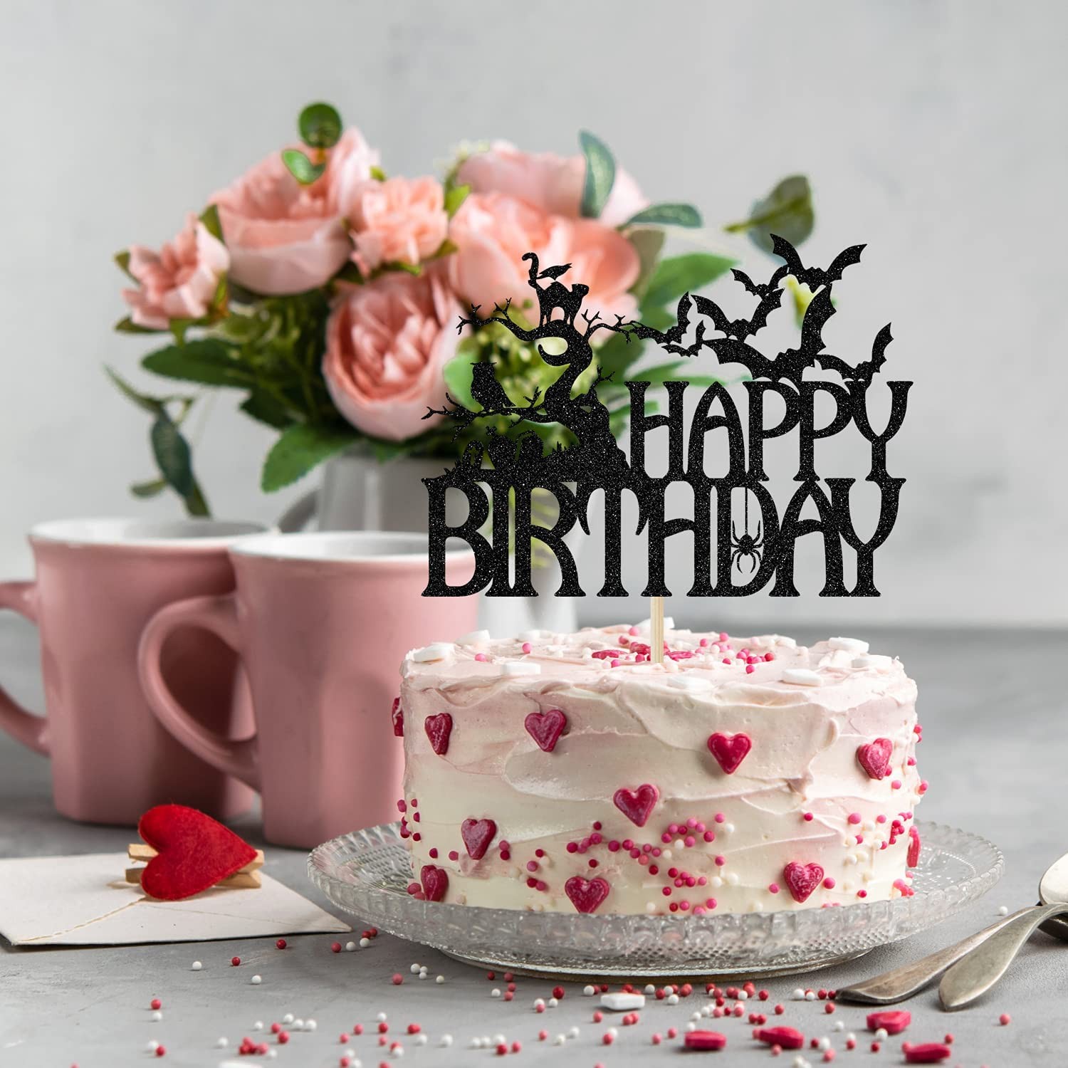 Ferastar Halloween Happy Birthday Cake Topper, Spooky Haunted House Black Glitter Cake Supplies, Creepy Birthday Themed Party Decor Black Glitter