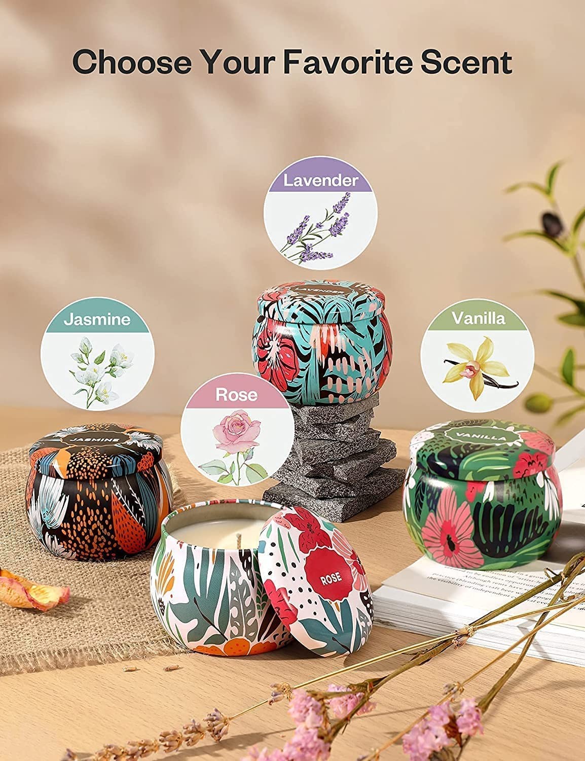 【Long Burn Time】:These cruelty-free scented candles for home scented are 4.6 OZ and burn up to 20-25 hours each, up to 100 hours total. Tin Candles: Compact candles 2.56 x 1.97 x 2.36 inches are perfectly sized take with you wherever you go, luxuriate in aroma for meditation, yoga, reading, etc.