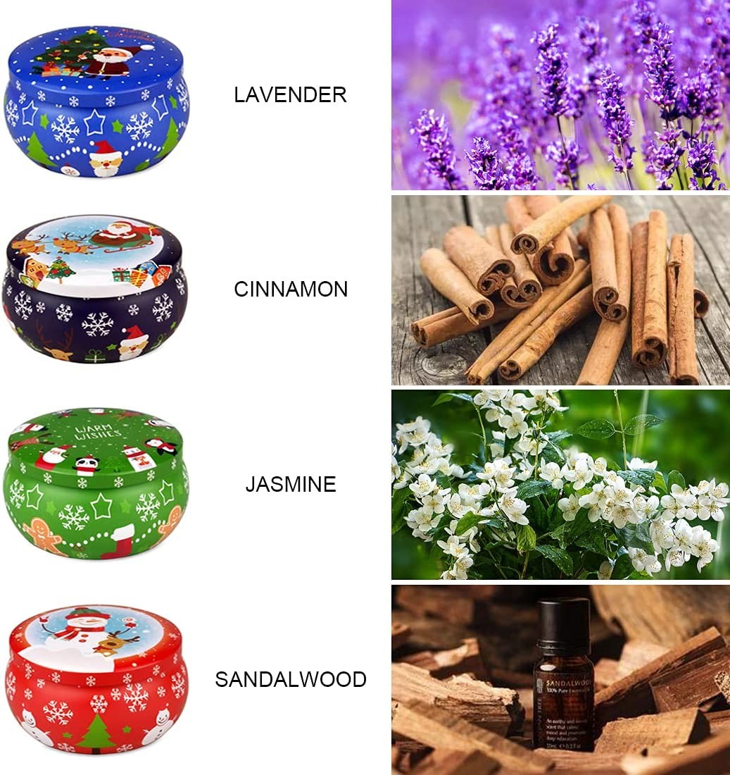 4 PCS Xmas Scented Travel Tin Candle Gift Packing - Natural Soy Wax, for Stress Relief Relaxation, Smokeless, Strong Fragrance, Long Lasting, for Christmas Eve Home Decor
