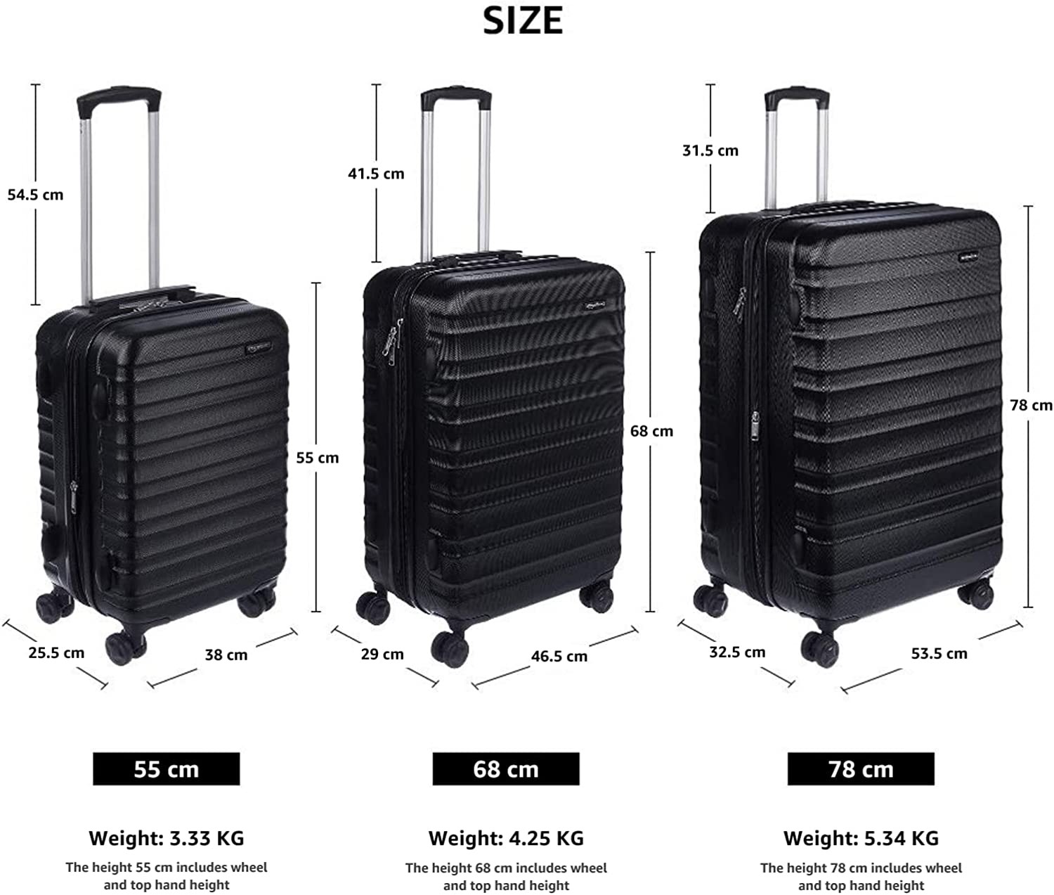 Hardside spinner luggage for work travel, weekend getaways, or as international carry-on Includes a 21-inch hardside spinner with a protective extra-thick ABS hard shell and a scratch resistant black finish 4 double spinner wheels ensure smooth-rolling mobility in any direction Sturdy telescoping handle for comfortable maneuvering and a securely mounted short handle for easy lifting Fully lined 150D-polyester interior organizer with divider, plus 3 zippered pockets for storing smaller items Expandable for up to 15% more packing space when needed Product dimensions: 10 x 14.9 x 22 inches (LxWxH, including wheels); interior dimensions: 9.6 x 13.3 x 18.5 inches (LxWxH)