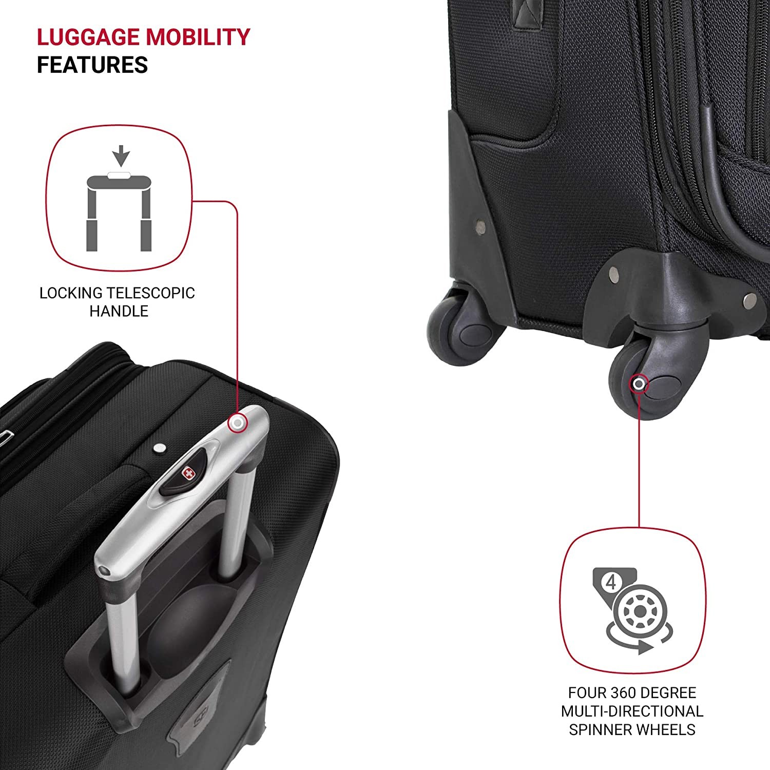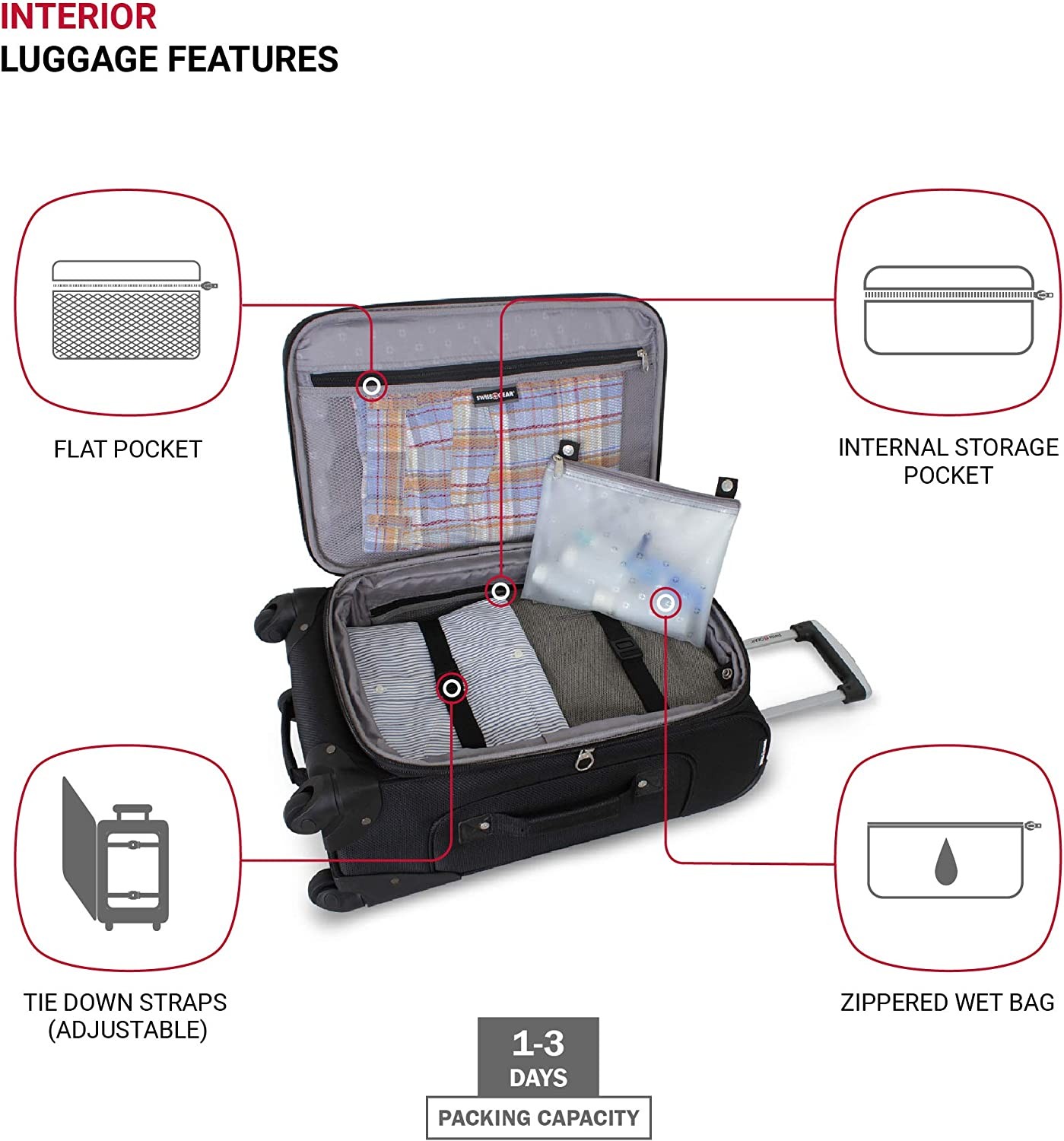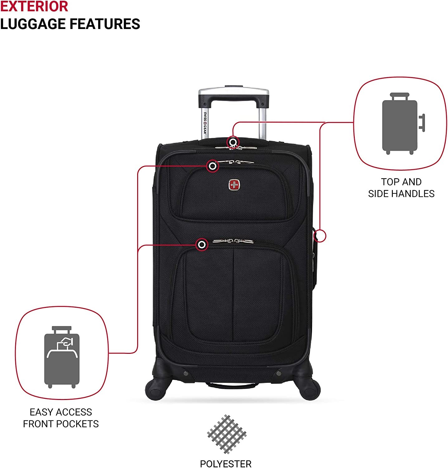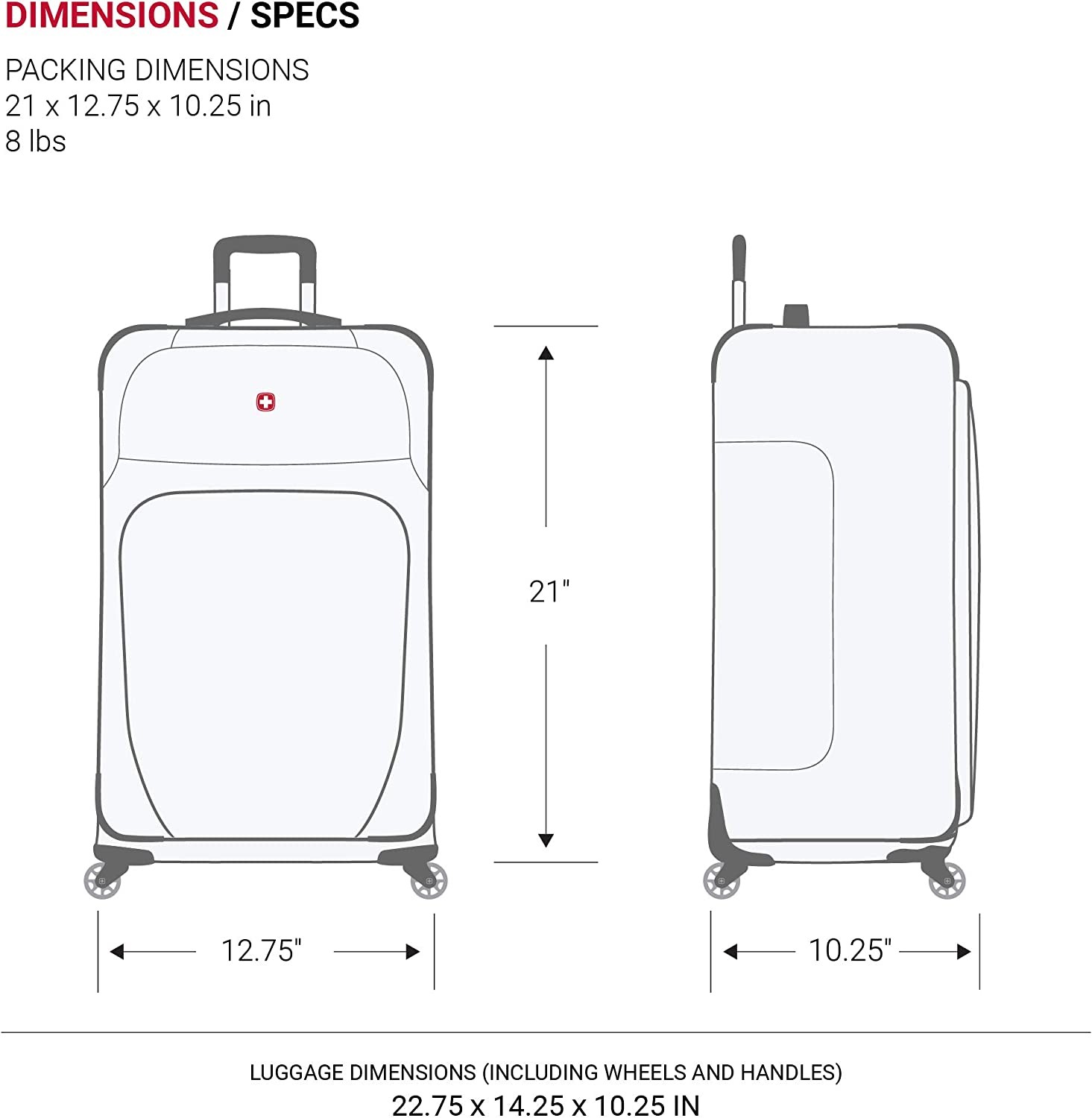 Rolling Suitcase: Get through a crowded airport or down narrow airplane isles easily with this stylish carry-on luggage with 360-degree multi-directional spinner wheels and a locking retractable push/pull handle Multiple Front Panel Pockets: Featuring front pockets with a built-in ID tag, this ergonomically expandable luggage measures 22.75 x 14.25 x 10.25 inches including wheels and handles; packing dimensions are 21 x 12.75 x 10.25 inches Secure and Durable: Expandable travel case gives you ample parking space and made from a durable, scuff-resistant polyester fabric with fully lined interior; also features adjustable tie-down straps for securing garments in place Effortless Organization: This luggage bag maximizes packing efficiency with a removable zippered wet bag, large mesh lid pocket, and packing pocket for holding small items and accessories Convenient Side Handles: With reinforced padded top handle with an integrated side and bottom handle, this roller suitcase makes lifting and carrying your luggage easy