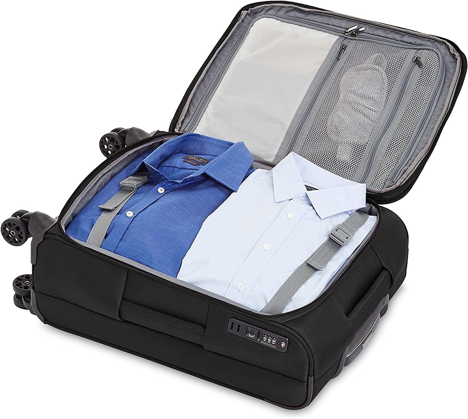 Premium 23-inch carry-on softside spinner for savvy travelers; built-in TSA lock provides an added level of security 4 double-wheeled spinners and sturdy telescoping handle ensure comfortable rolling and easy maneuverability Strategically placed support stabilizers help prevent the suitcase from tipping over Protective design features include crash-guard wheel housings, a skid guard, and molded corner guards Outer dimensions (including wheels): 15.7 x 9 x 23.2 Inches; Interior dimensions: 14.5 x 7.8 x 19.2 Inches Interior capacity: 36 Liters Weight: 7.19 lbs.