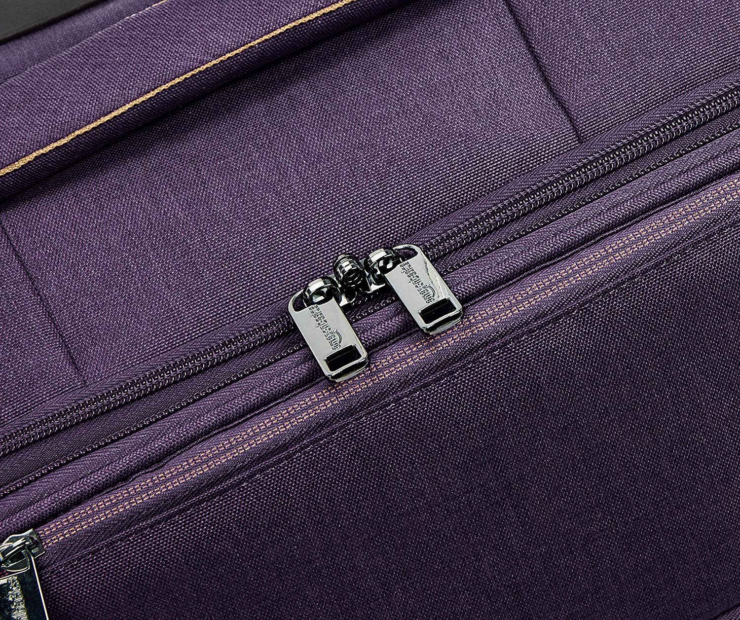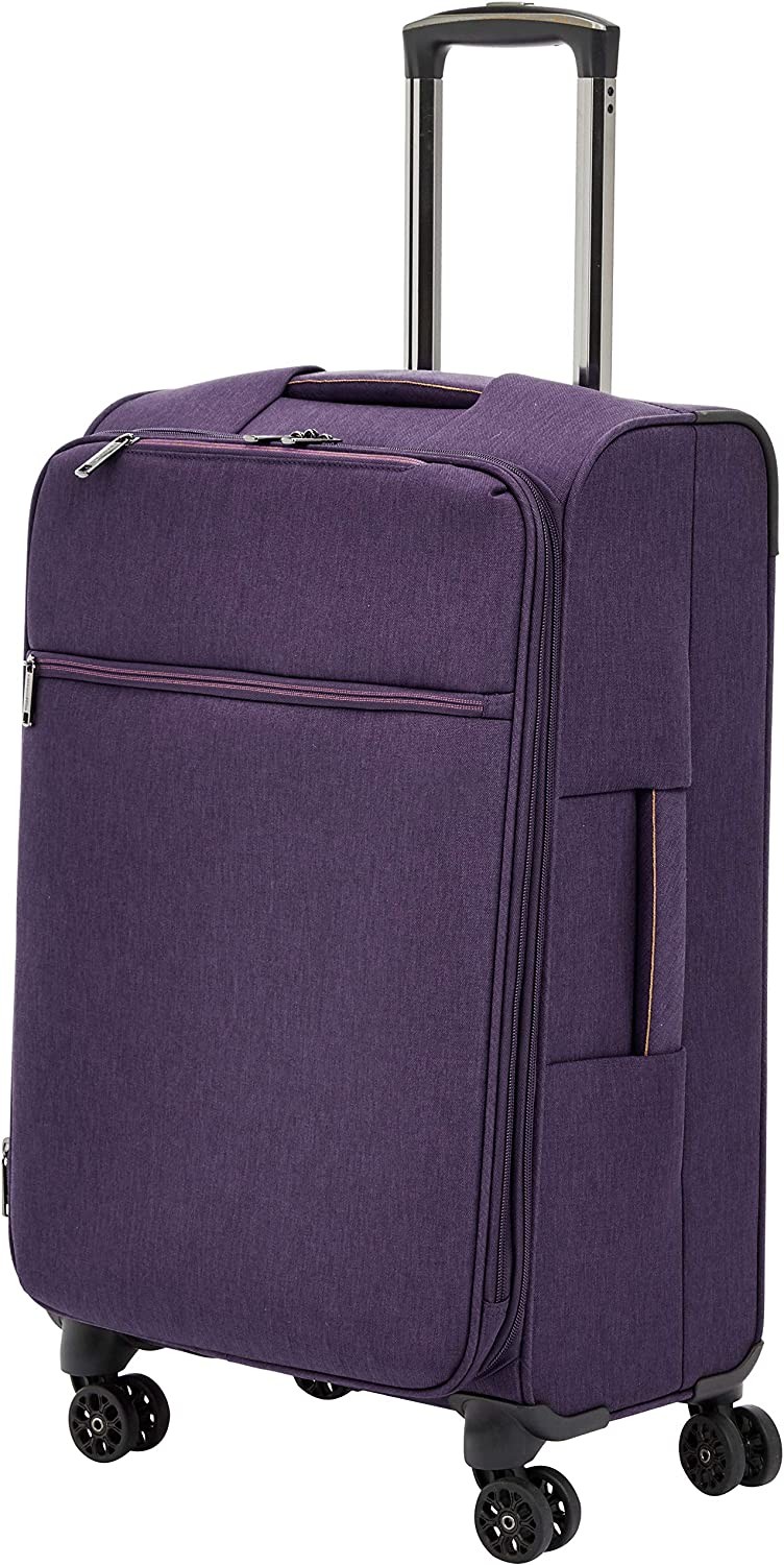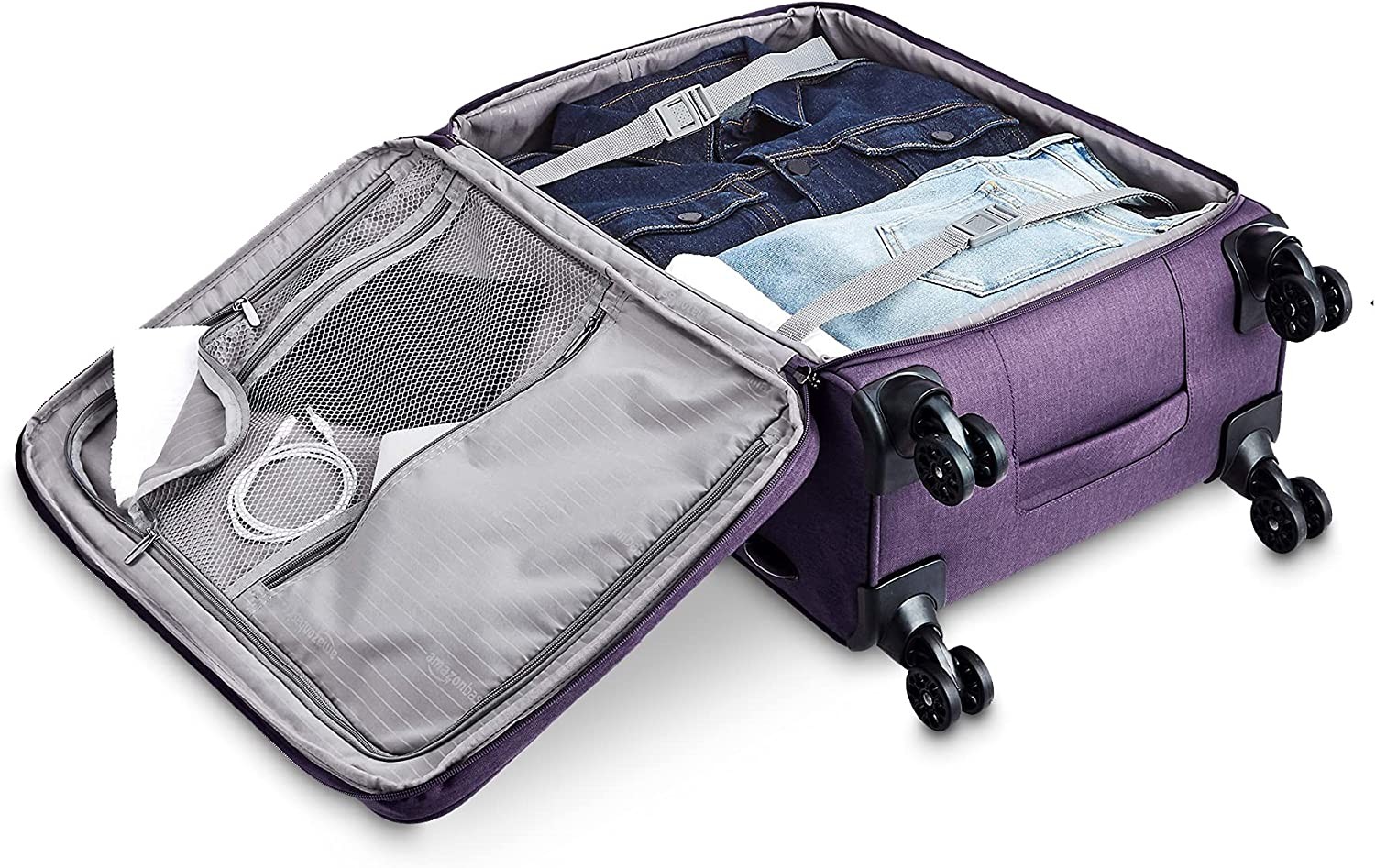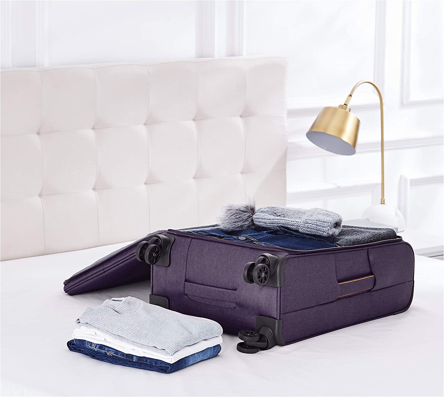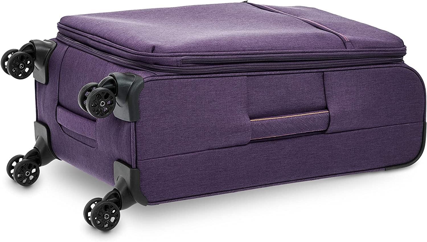 Purple, 21-inch Softside Expandable Spinner Suitcase Interior capacity: 31 Liters Weight: 5.73 lbs. Softside spinner made of durable 600D polyester with a stylish design for a fashionable, sophisticated appearance 2 front zippered pockets help keep stored items organized and easy to access; 150D-polyester interior organizer with 3 zippered pockets for conveniently storing smaller items Expandable for up to 25% more packing space; solid, strong zippers