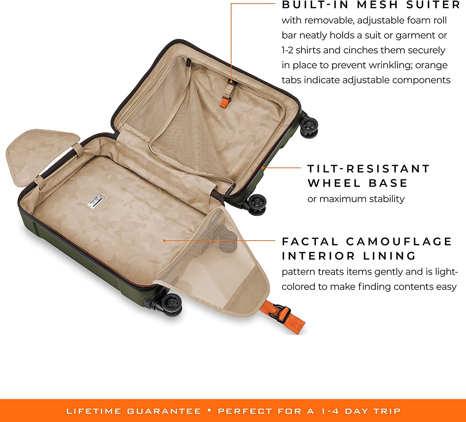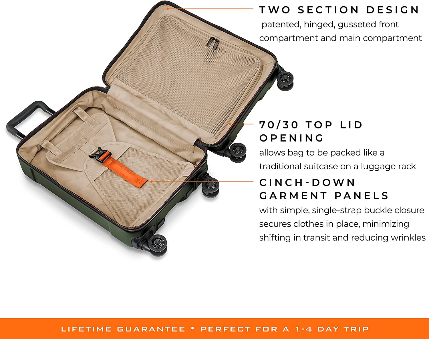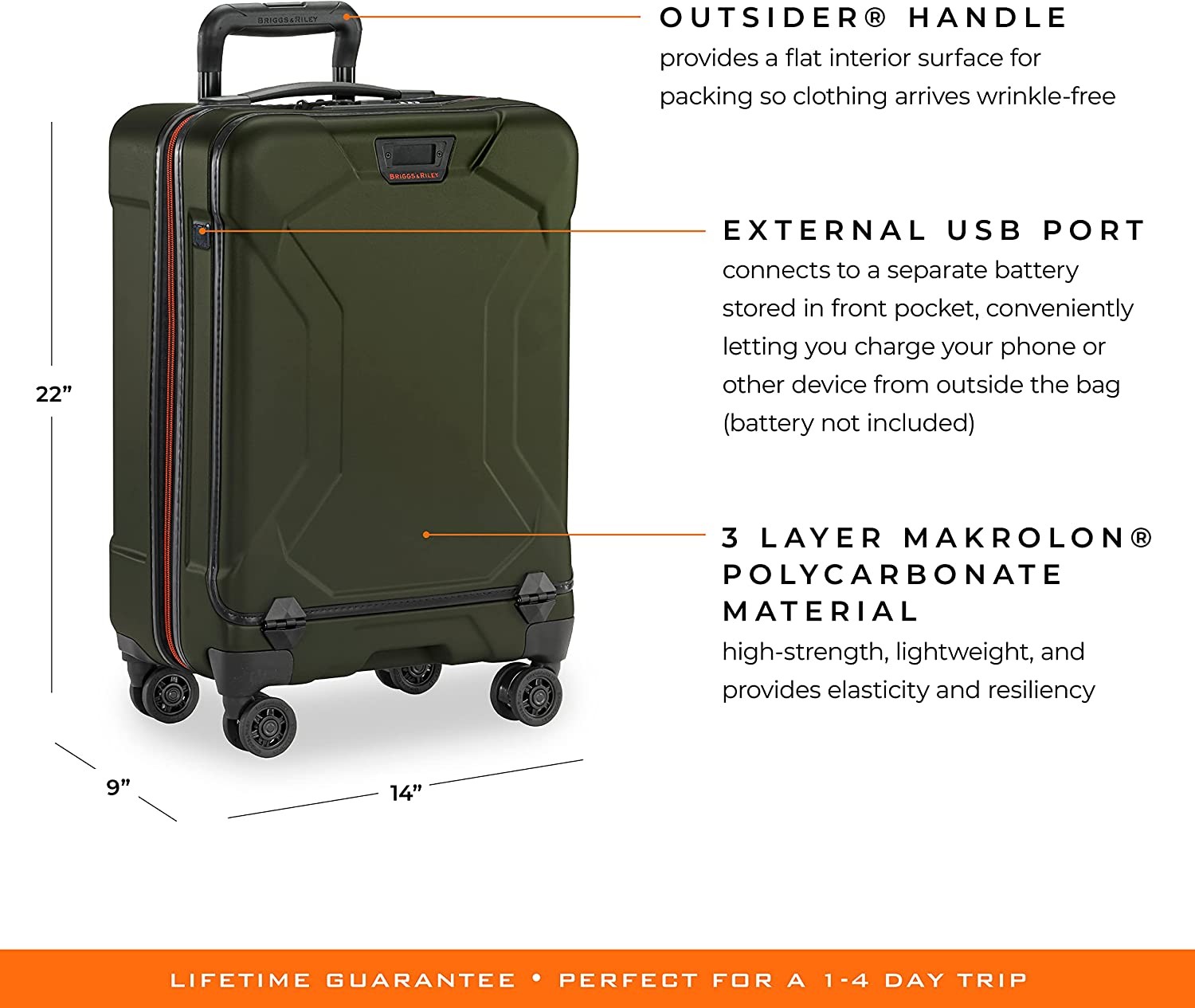 INNOVATION FIRST: The ONLY hardside spinner with a hardside front pocket, hinged door allows access to pocket during travel without opening entire suitcase; Store a laptop, travel items and power bank in front pocket; External USB port for mobile charging HIGHEST RATED LUGGAGE W/ LIFETIME WARRANTY: Two-time Top rated luggage brand by Consumer Reports reader survey, extensive quality and durability tested; If your bag is ever broken or damaged, even by an airline, Briggs & Riley will repair it for free HIGH PERFORMANCE LUGGAGE: 3-layer 100% virgin Makrolon polycarbonate material is high-strength, lightweight & resilient to minimize cracks; Aircraft-grade aluminum telescoping Outsider handle with 4 stop heights; Metal ball-bearing double spinner wheels ORGANIZATION FOR TRAVEL: Front compartment has padded laptop & tablet slips protecting most 15 Inch laptops & 10.5 Inch tablets; Main compartment has wide garment securing compression panels and mesh pocket in lid features built-in garment suiter DIMENSIONS AND CAPACITY: 22 Inch H x 14 Inch W x 9 Inch D. 2741.1 cubic inches capacity. Weighs 6.9 lbs. Dimensions include wheels and handle.