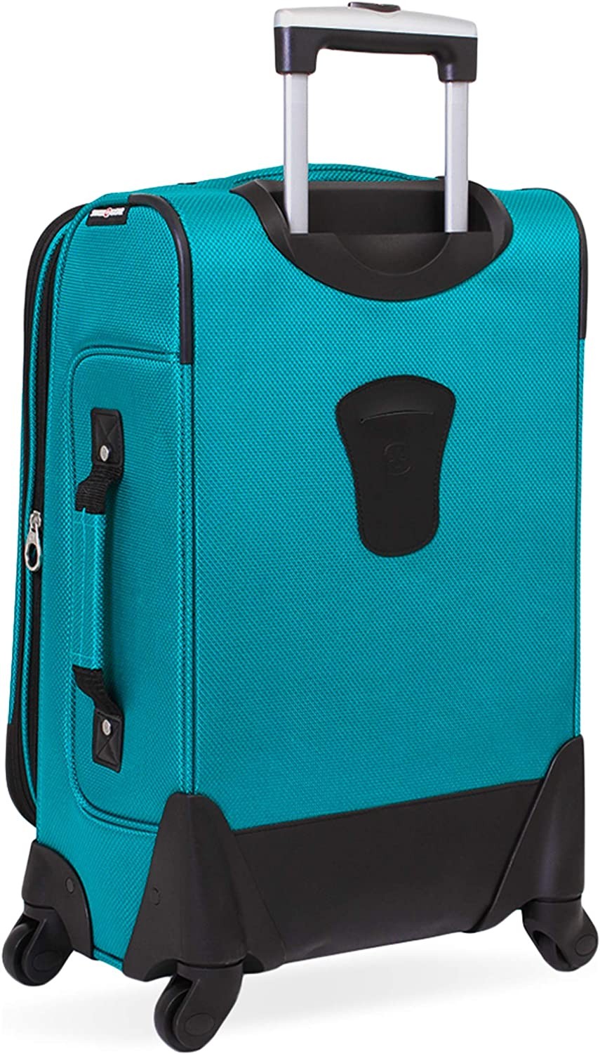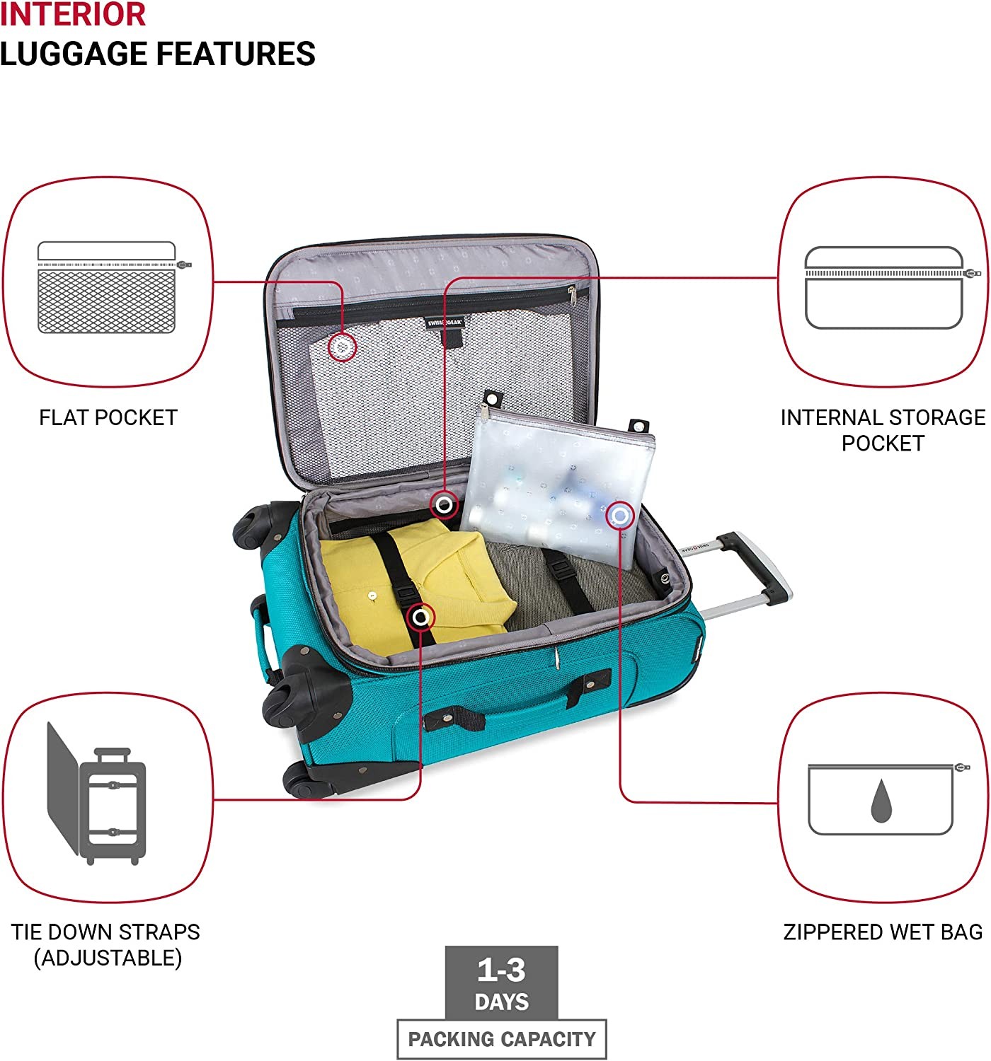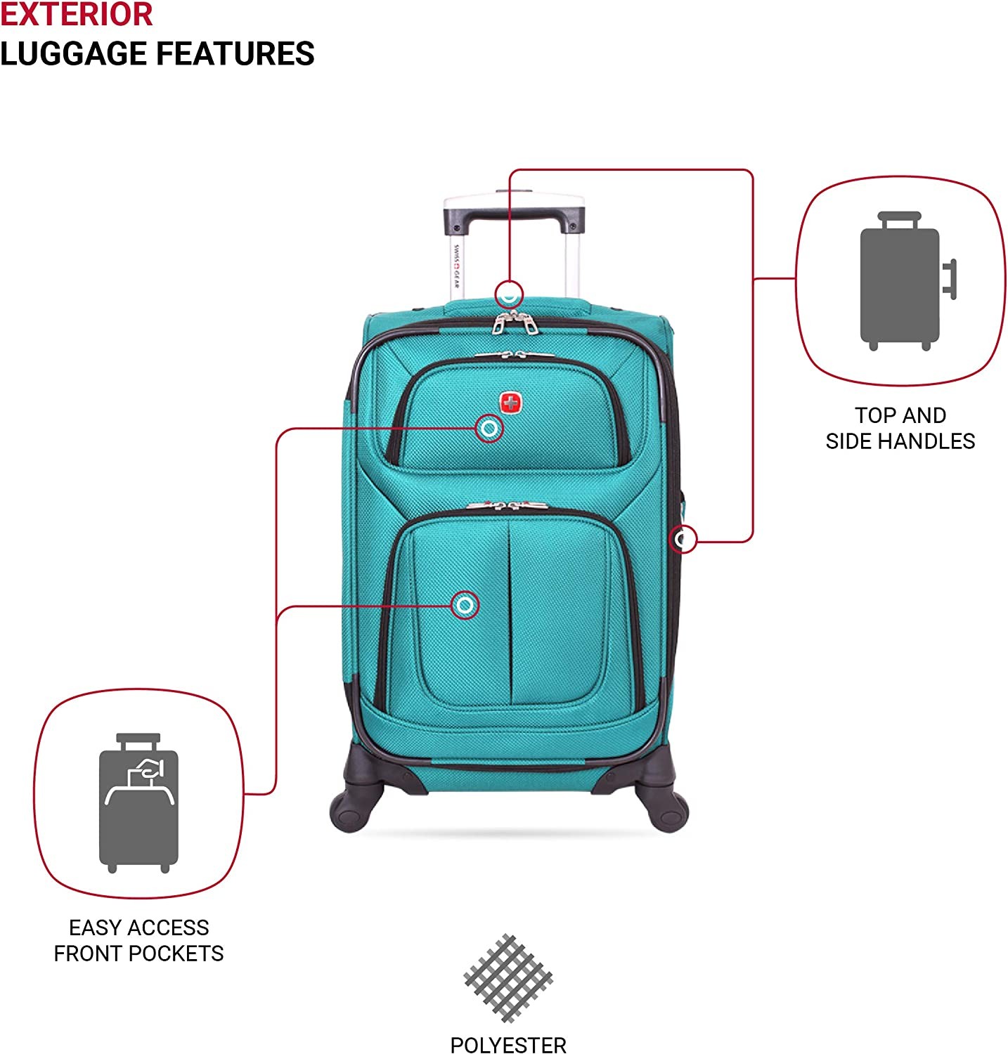 Rolling Suitcase: Get through a crowded airport or down narrow airplane isles easily with this stylish carry-on luggage with 360-degree multi-directional spinner wheels and a locking retractable push/pull handle Multiple Front Panel Pockets: Featuring front pockets with a built-in ID tag, this ergonomically expandable luggage measures 22.75 x 14.25 x 10.25 inches including wheels and handles; packing dimensions are 21 x 12.75 x 10.25 inches Secure and Durable: Expandable travel case gives you ample parking space and made from a durable, scuff-resistant polyester fabric with fully lined interior; also features adjustable tie-down straps for securing garments in place Effortless Organization: This luggage bag maximizes packing efficiency with a removable zippered wet bag, large mesh lid pocket, and packing pocket for holding small items and accessories Convenient Side Handles: With reinforced padded top handle with an integrated side and bottom handle, this roller suitcase makes lifting and carrying your luggage easy