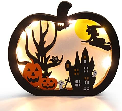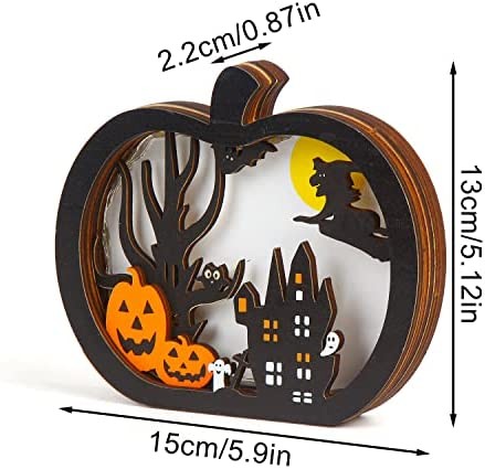 Halloween Pumpkin Table Decor:The Halloween wooden table sign feature pumpkin appearance,comes with Halloween themd embellishments,such as,Jack-o-lantern,witch,bat,ghost,scary castle,tombstone and tree.Festive additiob to your table decoration. Material:The Halloween table topper is made of wood,sturdy and durable.The flat base helps the pumpkin stand on the table steadily. Size:The pumpkin table centerpiece decor measures 5.9inches in lenght and 5inches in height.Great size for decorating your home. Light Up Pumpkin:Our Halloween pumpkin decor is inserted with fairy lights,which powered by 2 coin cell batteries-CR2032(NOT INCLUDED).And the two batteries should be installed in opposite way!Easy to switch on and off.Bring you more festive atmophere in Halloween. Wide Application:The Halloween wooden sign is perefct to be placed on home,office,classroom and anywhever you want.It also can be ideal gift for your kids,friends and collegues.