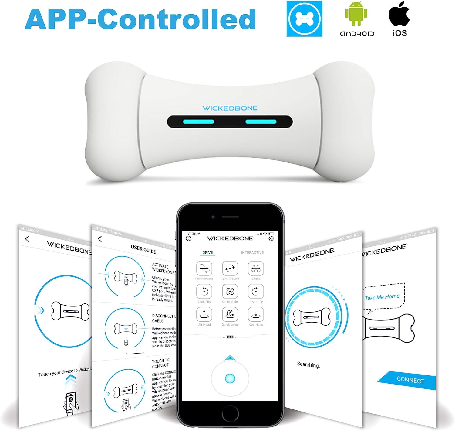 Automatic & Intelligent: Choose between interactive auto-play modes or control the puppy toy by using joystick in drive mode via the app. It can automatically adjust how it reacts based on different actions of your dog! Auto Play Mode: Programmed to attract your dog’s attention and does not require manual operation! By built-in 12 types of emotional driven systems, Wicked bone acts responsively to different types of touch, such as chasing, teasing, avoiding, etc. Drive Mode: Control the dog toy through the Wicked bone available for iOS and Android), and move it with its virtual joystick, choosing between the puppy toy's 9 Available motions, and you’ll soon create and discover new action combos as it runs! Safe & durable: FDA food-grade polycarbonate of the body, cover, and the tires, strong and soft, protects your puppy's claws and teeth. Easy to clean: Its detachable tires and protecting cover are very easy to take off, thus could be quickly and conveniently cleaned! Good puppy chew toy! Long battery life: built-in 470 mAh lithium polymer battery, charging for 1 hour, lasting more than 30 minutes in App mode, more than 2 hours in interactive mode, 1 month in sleep mode! Worry-free Service: We offer 24-hour customer support and are happy to respond to all types of questions at help@meiou. Tech