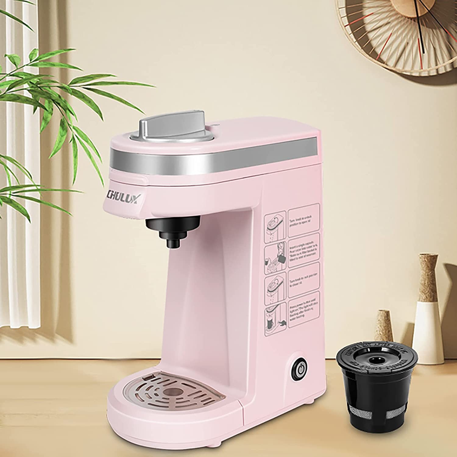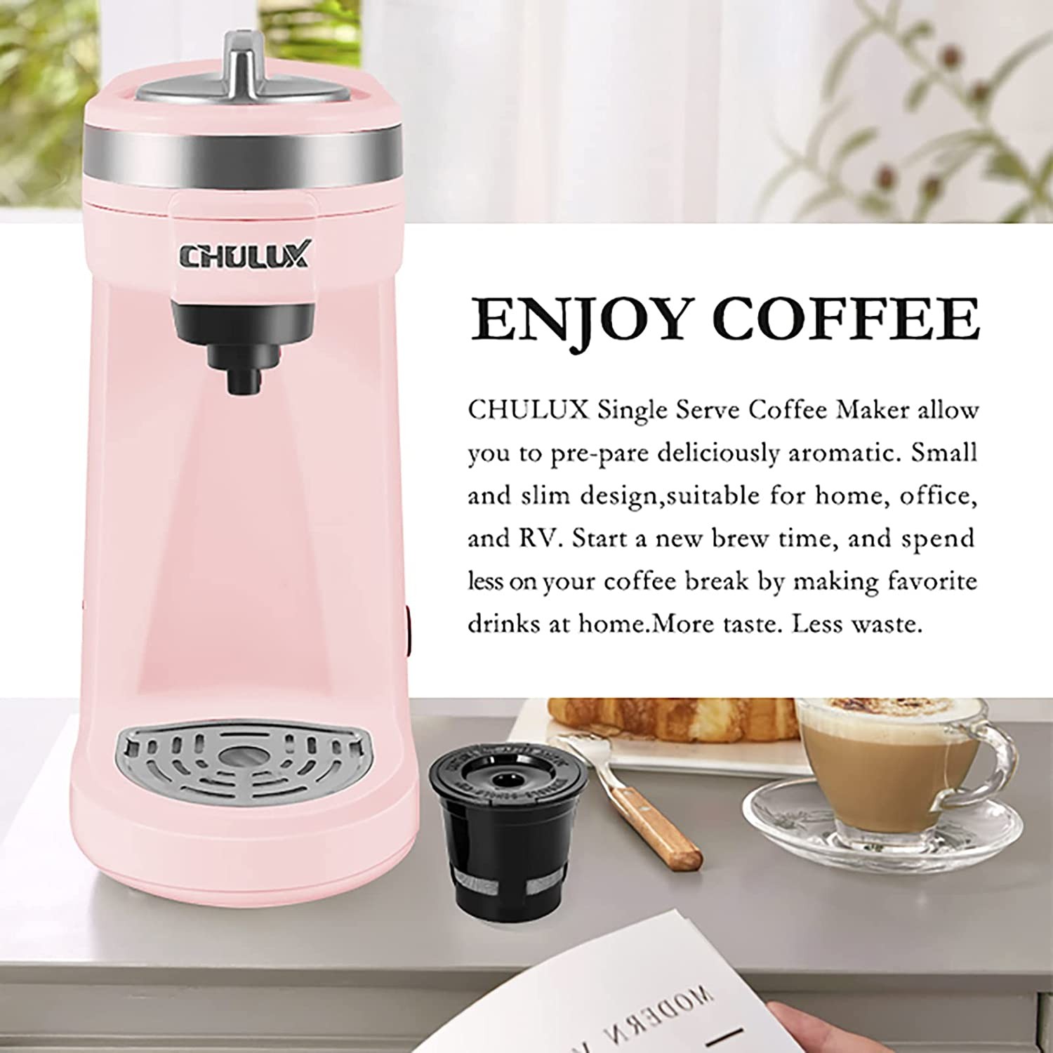 【SINGLE CUP COFFEE BREWER】 CHULUX single serve coffee maker compatible with 1.0 and 2.0 pod coffee capsules. Also suitable for use ground coffee (Included a black reusable filter ) to create your private cafe at leisure or busy moment. 【A QUICK COFFEE MAKER】800W heating element with rapid brewing technology by blue indicator light flash,also features auto shut-off preventing from overheating,keeping safe and help saving energy.One cup of hot brewed coffee will ready for you within 3mins. 【MUG SIZES COMPATIBLE】The coffee flows out is almost same as the water amount you poured in,ensure every fresh coffee by maximize utilization.The single coffee brewer supports for travel mugs up to 5.3"tall by removing drip tray. 【BUSINESS TRIP AND HOME USE】The compact size is perfect for trip or limited countertop.The portable mini brewer easy to carry anywhere,friendly for office,kitchen,guest room,hotel and RV. But only feasible for 120V voltage within 6000feet altitude. 【EASY TO CLEAN】BPA-FREE material for water tank and piercing needle. Detachable filter basket and drip tray can be removed and washed directly. A easy clean method by pressing button after adding in water and vinegar.