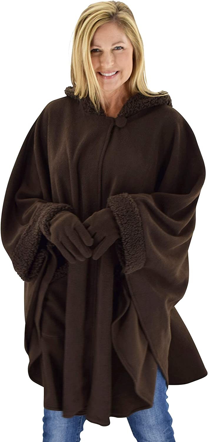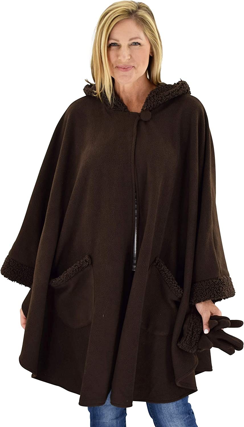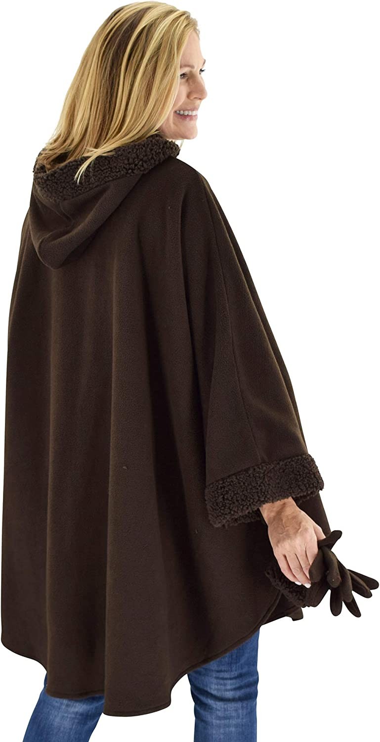 Le Moda Women’s Hooded Tonal Sherpa Trimmed Wrap with Matching Gloves | Winter Collection | One Size Fits All