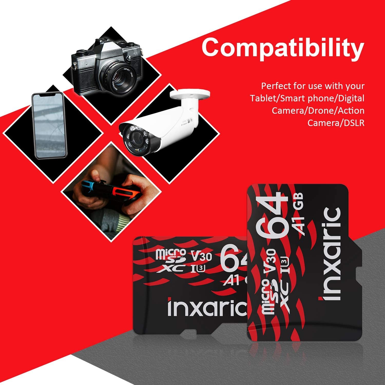 Lexar 64GB Micro SD Memory Card supports UHS-I, U3, Speed Class 10, Video Speed Class 30 (V30) , which offer high read speed, fast file transfer speed, smooth as well as continuous shooting and Full HD video 4K and 1080P recording. For apps, A1 (App 1) performance is continuous 1500 read IOPS, 500 write IOPS, which helps not only run faster, but also save smartphone's or tablet's storage memory.