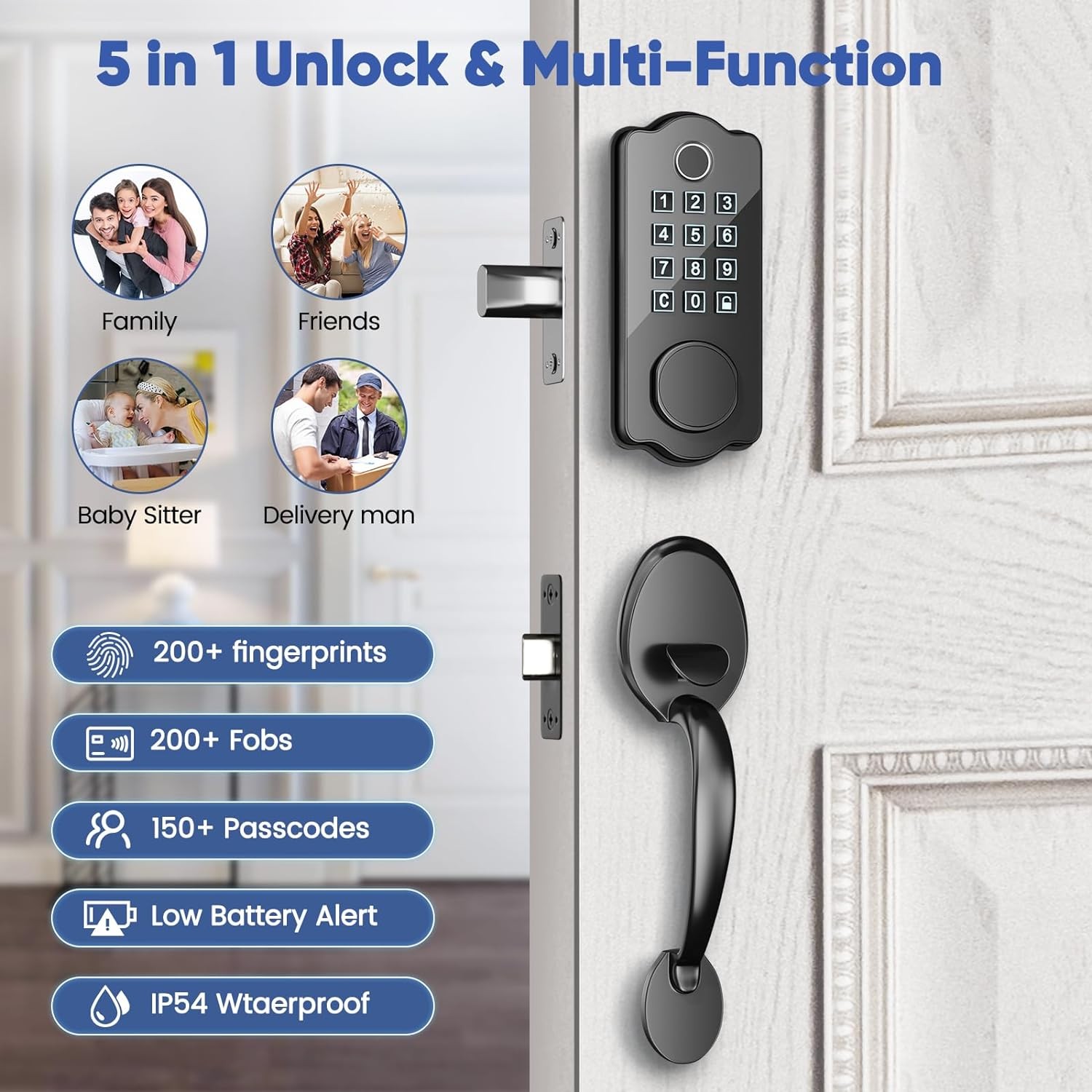Front Door Lock Set, ADIUIVE Fingerprint Keyless Entry Door Lock with Handle, Smart Locks for Front Door, Electronic Keypad Door Lock Work with App Control Auto Lock(Keypad+Fingerprint+Key+IC+APP)